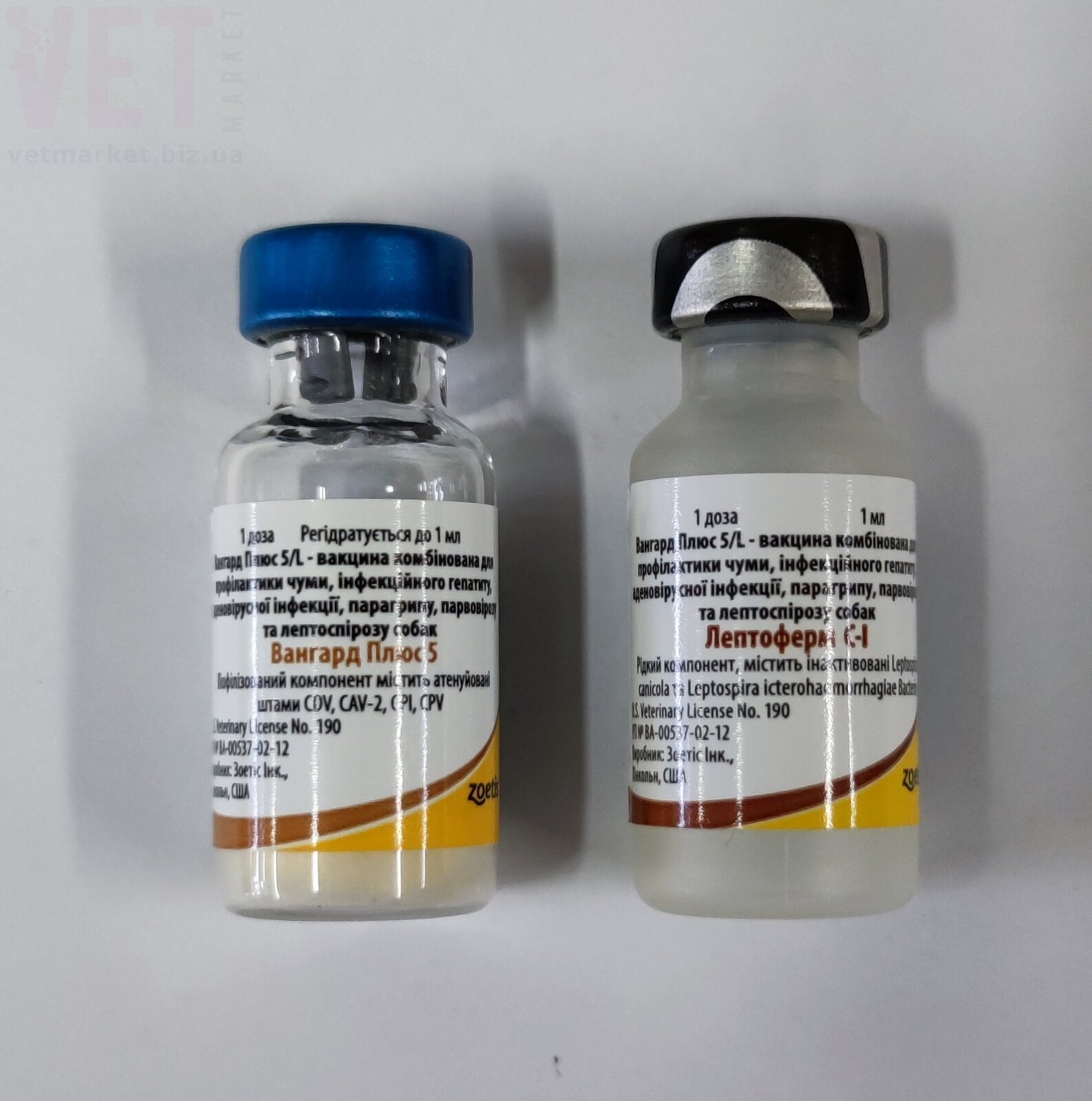 Щільно укупорені однодозові скляні флакони, що вміщують ліофілізовану фракцію (Вангард Плюс 5) та однодозові пластикові флакони, що вміщують рідку фракцію вакцини (Лептоферм С-І).