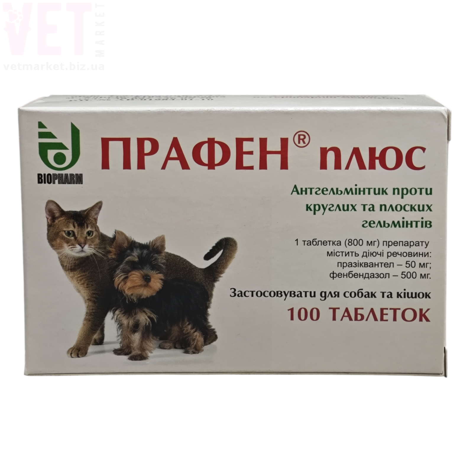 Препарат Прафен® плюс виявляє комплексний антигельмінтний вплив на нематоди і цестоди м’ясоїдних. Празиквантел, що входить до складу препарату, викликає загибель цестод, які належать до родів Alveococcus, Echinococcus, Dipylidium, Taenia, Multiceps, Mesocestoides. Фенбендазол спричиняє загибель нематод, що належать до родів Тохосаrа, Toxascaris, Uncinaria, Ancylostoma, Trichuris, а також підсилює дію празиквантелу на цестод. Одночасний вплив празиквантелу та фенбендазолу зумовлює антигельмінтну дію на переважну кількість гельмінтів, що паразитують у м’ясоїдних тварин.