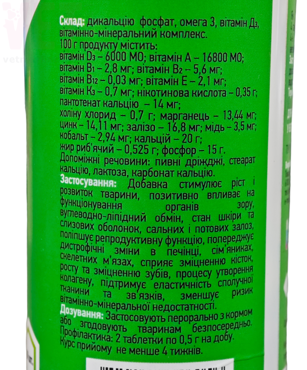 Добавка має сукупні фармакологічні властивості окремих компонентів (вітамінів і мінералів). Добавка допомагає зміцненню кісток і зубів ваших вихованців.