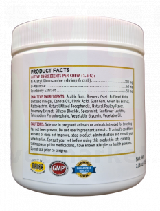 N-ацетил Глюкозамін (креветки та крабі) - 100 мг, D-маноза - 50 мг, Екстракт журавлини - 50 мг. Допоміжні речовини: аравійська камедь, пивні дріжджі, буферний білий дистильований оцет, олія каноли, лимонна кислота, камедь гуару, екстракт зеленого чаю, мальтодекстрин, натуральні змішані токофероли, натуральний аромат птиці, екстракт розмарину, діоксид кремнію, м ята, соняшниковий лецитин, тетранатрієвий пірофосфат, рослинна олія.