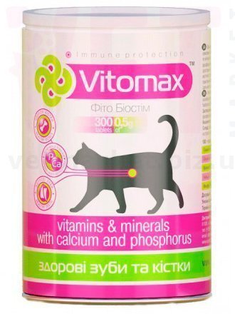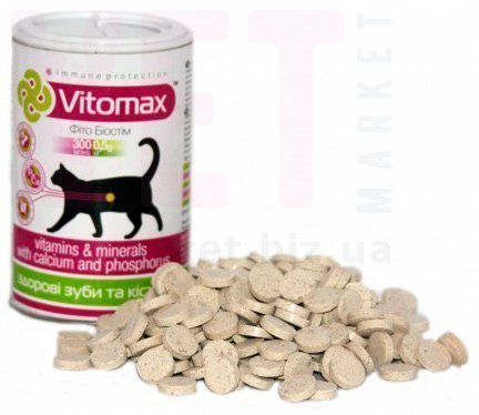 Добавки в виде фосфора, кальция должны присутствовать в рационе каждого кота. Ежедневная еда, как правило, этих элементов содержит недостаточно. Это обязательные компоненты, необходимые для правильного и гармоничного развития мышечно-костного скелета животного и его зубов. Внесите ингредиенты в корм питомца дополнительно, воспользовавшись витаминным комплексом Vitomax.