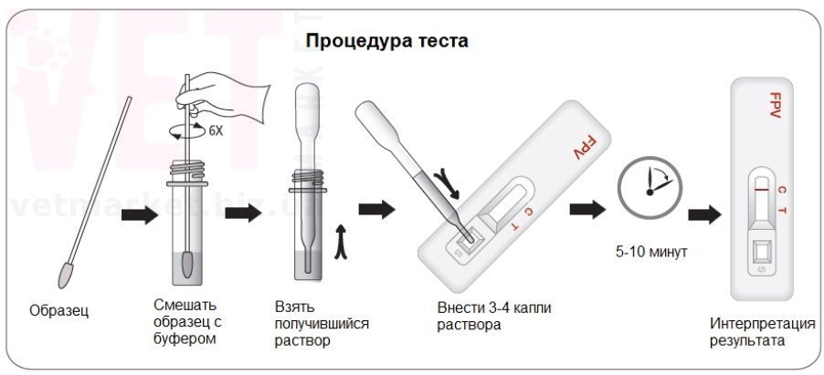 СБОР И ХРАНЕНИЕ ОБРАЗЦОВ Образцом является кошачий фекальный материал. Взятые образцы должны быть протестированы как можно быстрее. При необходимости они могут храниться при 2-8 ° С до 48 часов. Если требуется более длительное хранение, образец может быть заморожен при температуре -20 ° С. ПОРЯДОК ПРОВЕДЕНИЯ АНАЛИЗА 1. Перед проведением теста поместите все образцы и компоненты теста в комнатную температуру (15-30 мин) 2. Извлеките тестовое устройство из герметичного пакета и поместите его на ровную и чистую поверхность. 3. Ватной палочкой проведите забор образца кала в 4 разных точках, либо сделайте забор образца непосредственно из толстой кишки кота. 4. Окуните ватную палочку в пробирку с буферным раствором для анализа, пока образец не растворится. 5. Внесите 3-4 капли (около 100ul) полученного раствора, взятого одноразовой пипеткой, в лунку для образца (S). 6. В течение 10 минут интерпретируйте результат (ы) теста. Результаты после 20 минут являются не действительными. ИНТЕРПРЕТАЦИЯРЕЗУЛЬТАТОВ