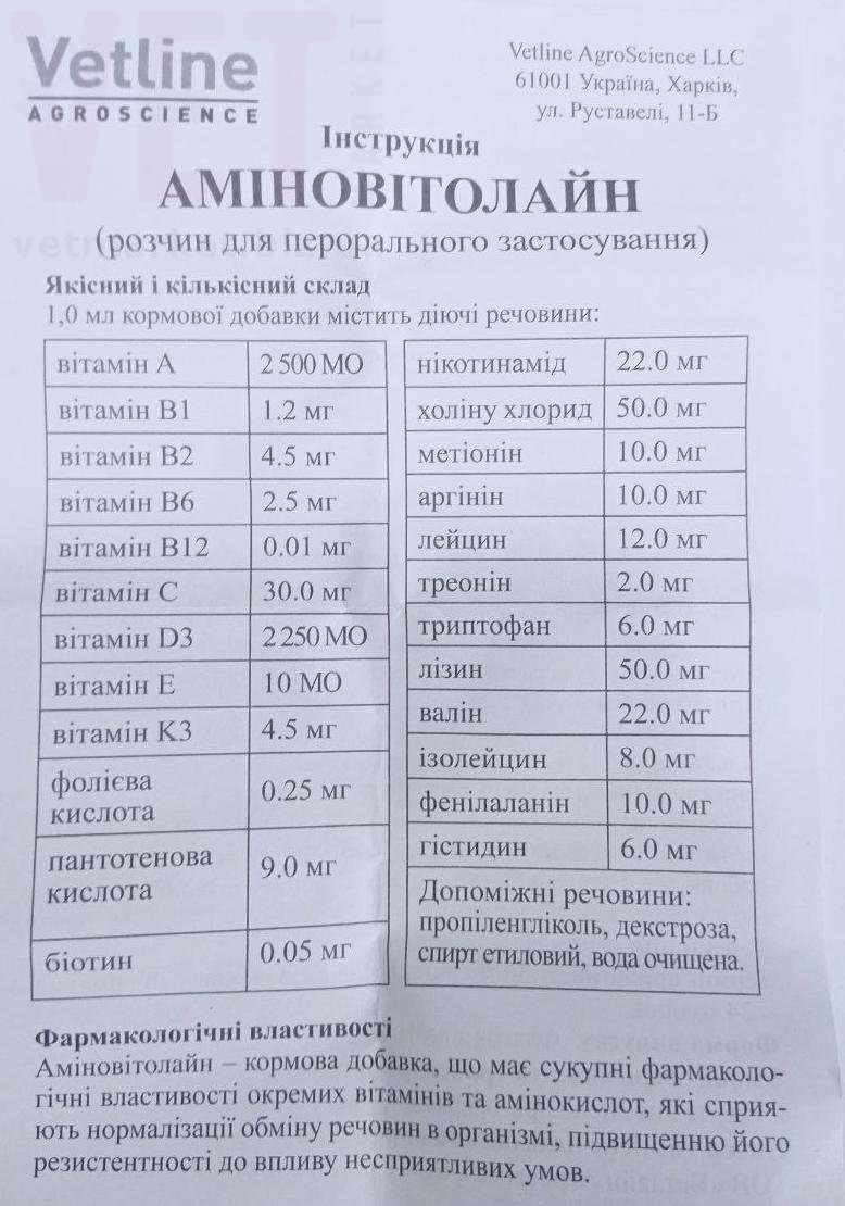 КоличествоАміновітолайн – кормова добавка, що має сукупні фармакологічні властивості окремих вітамінів та амінокислот, які сприяють нормалізації обміну речовин в організмі, підвищенню його резистентності до впливу несприятливих умов.