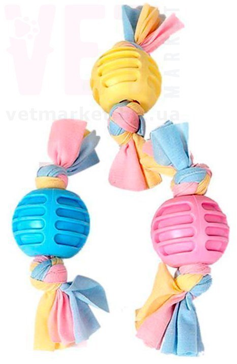 Резиновая игрушка для собак "Мячик с узелками". Изготовлена из высококачественного безопасного латекса и тканого хлопка, которые не разрываются и не растрескиваются при деформациях. Отличается долговечностью и очень высокой прочностью, долго сохраняет свою форму.