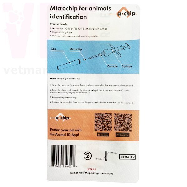 КоличествоA-Chip Premium Mini разработан для идентификации мелких домашних животных, включая кошек, собак, а также кроликов или хорьков. Инъектор оснащен высококачественной канюлей и микрочипом. Это обеспечивает бесстрессовую процедуру идентификации, подкрепленную пожизненной гарантией. Каждый микрочип имеет уникальный идентификатор, соответствующий стандартам ISO 11784/5, размещенный в капсуле из биосовместимого стекла Schott для долговечности и безопасности.
