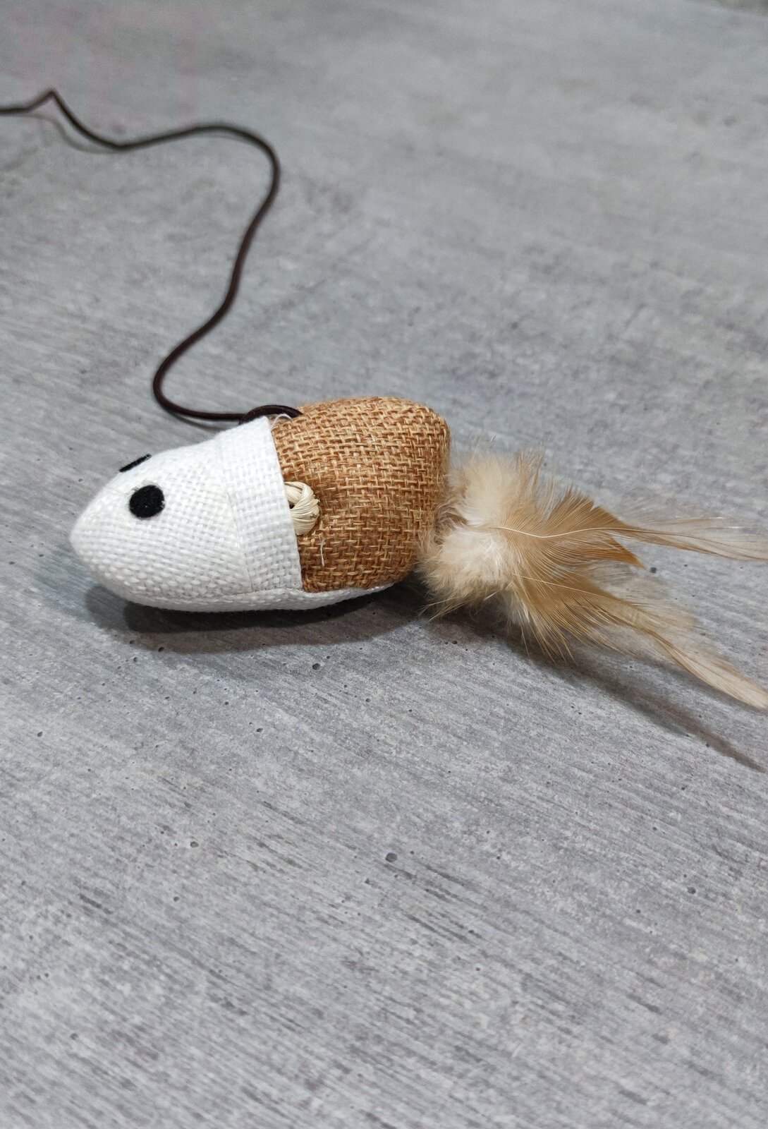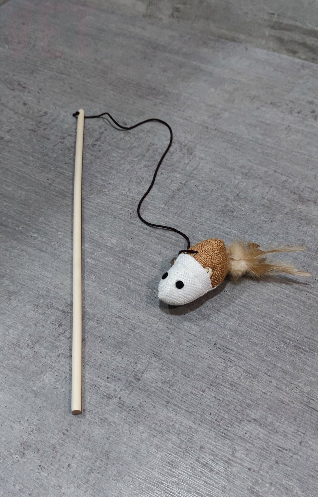 Стильную эко-удочку из дерева будет очень приятно держать в руке, а мышка из мешковины с хвостиком-перышком понравится Вашему котику.