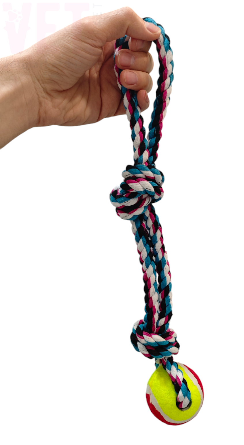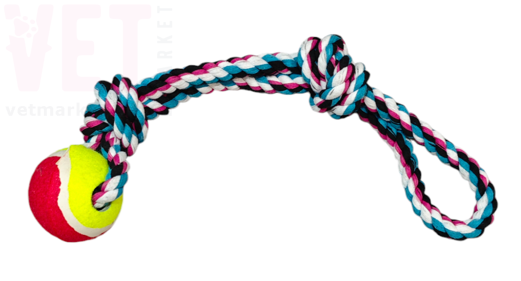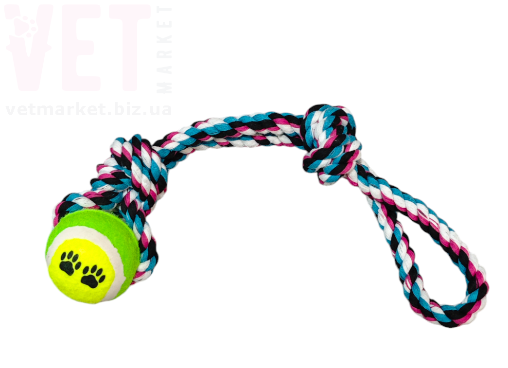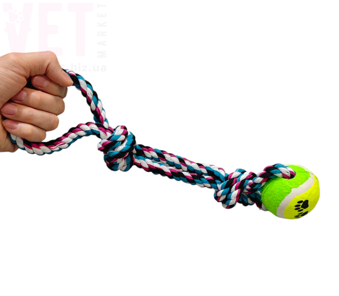 КоличествоИгрушка канат грейфер петля с мячом для собак и щенков. Жевательная веревка обеспечивает чистку зубов, массирует десны. Используется для игр, обучения, дрессировки, мячик в процессе игры принесет дополнительное удовольствие домашнему питомцу.