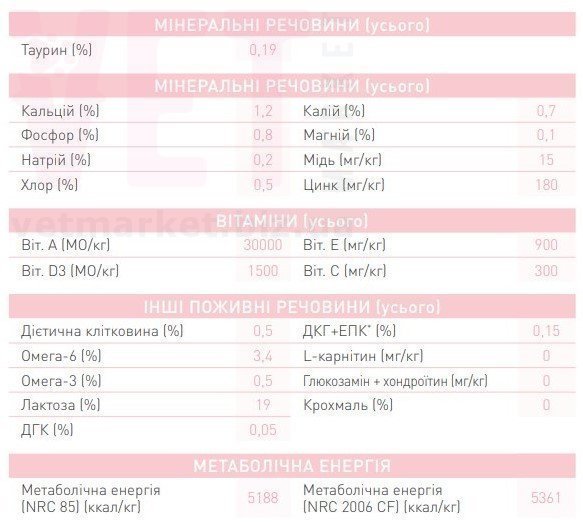 Формула містить основні поживні речовини, що містяться в молоці кішки.