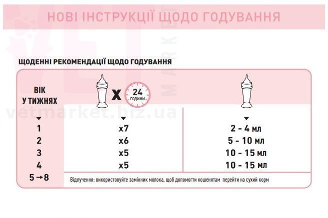 BABYCAT MILK миттєво розчиняється, утворюючи абсолютно однорідний замінник молока (див. інструкцію з вико-