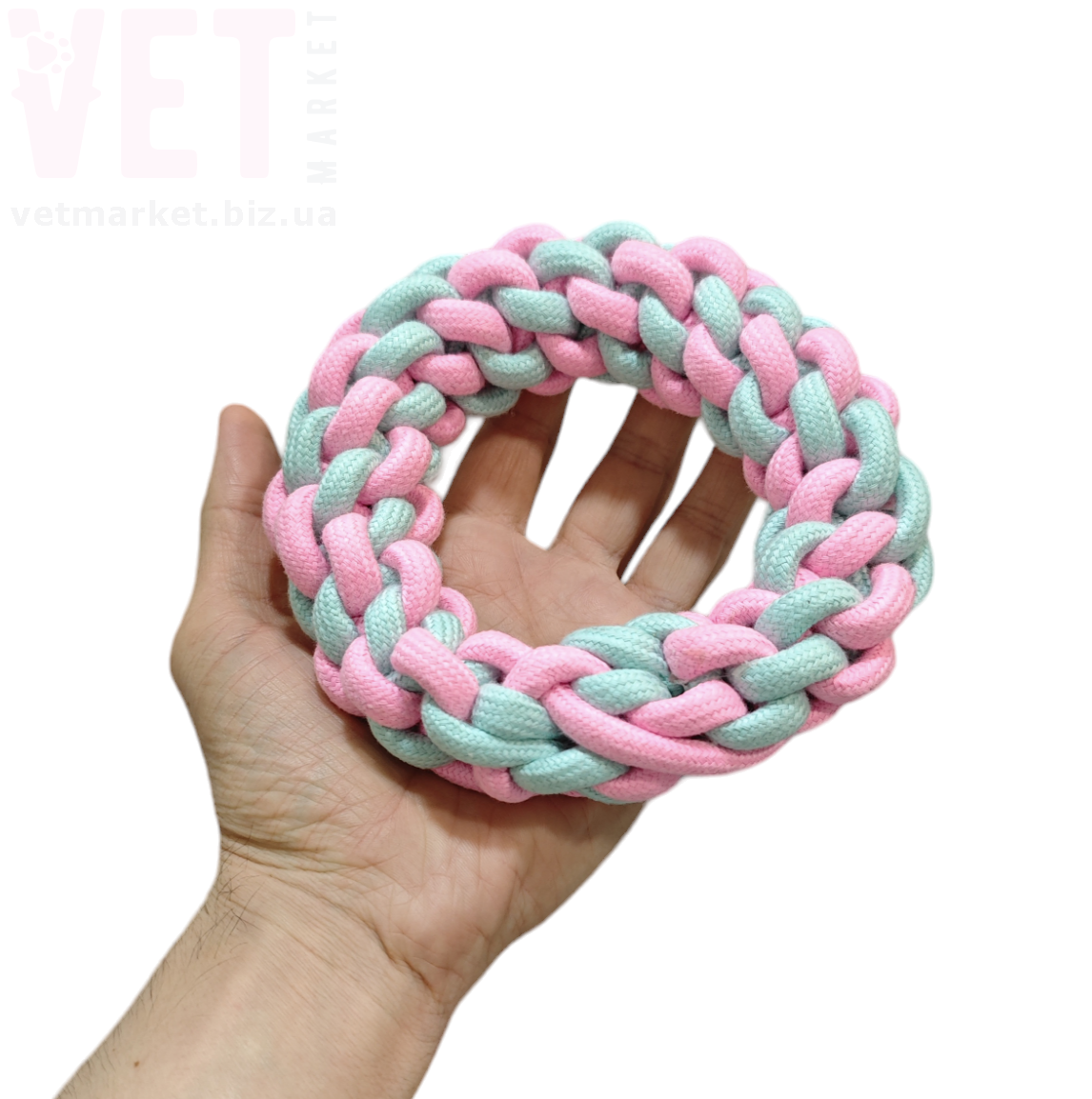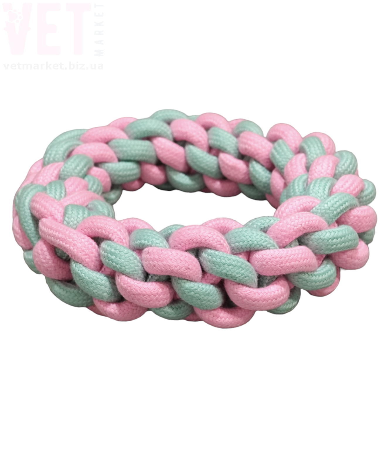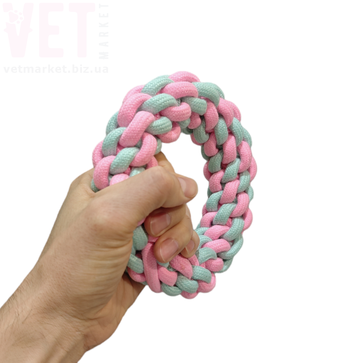 Игрушка для собак плетеный канат грейфер в форме кольца. Изготовлена из высококачественного тканого хлопка. Отличается долговечностью и очень высокой прочностью в играх собакой, игрушка долго сохраняет свою форму.