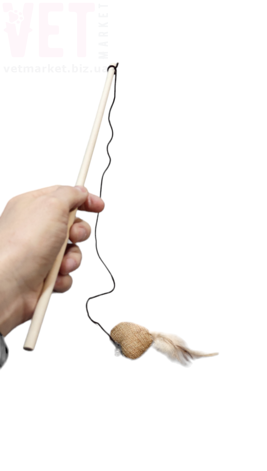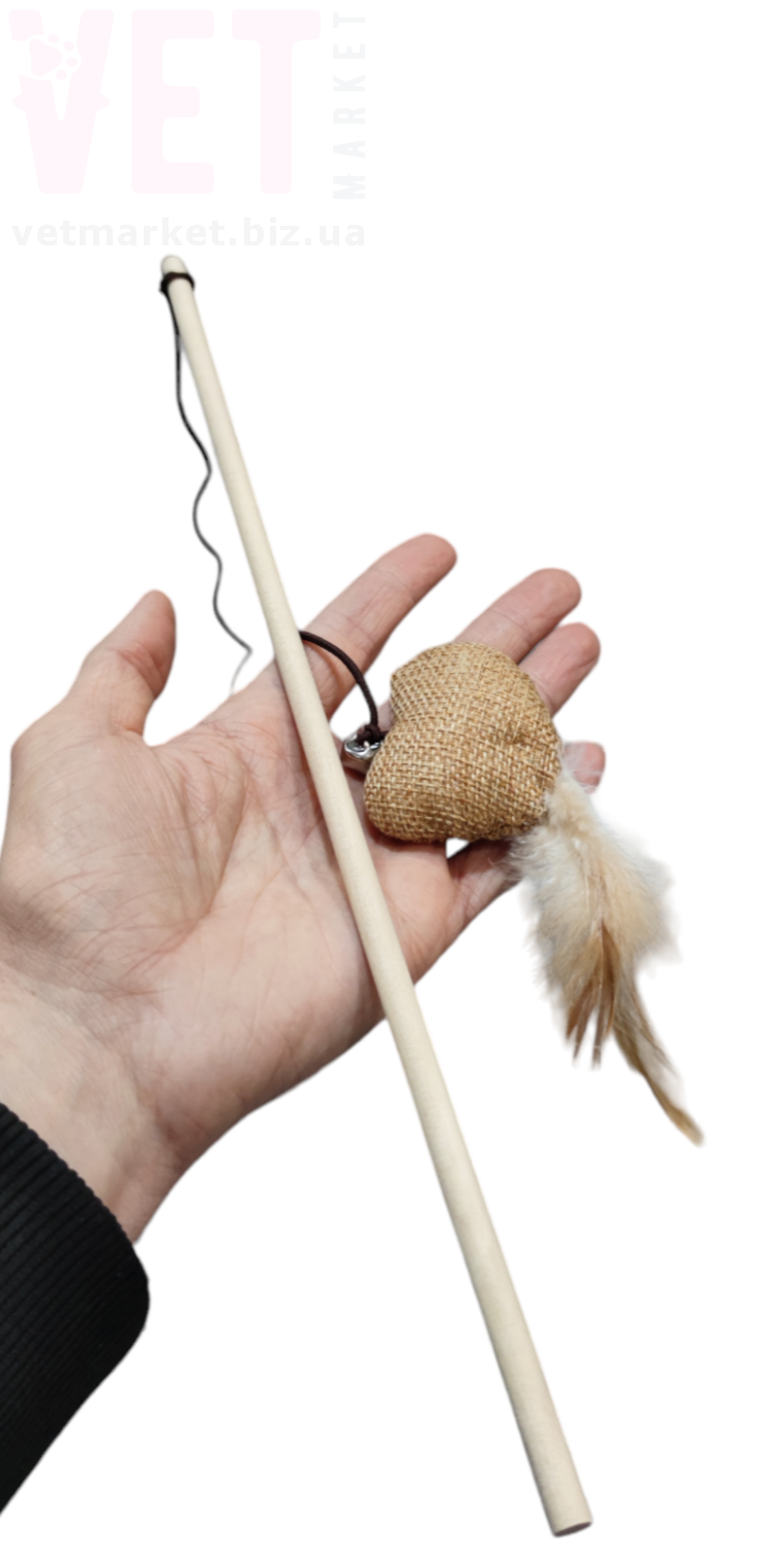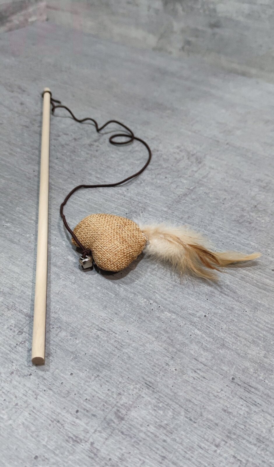 Стильную эко-удочку из дерева будет очень приятно держать в руке, а птичка из мешковины с хвостиком-перышком понравится Вашему котику.