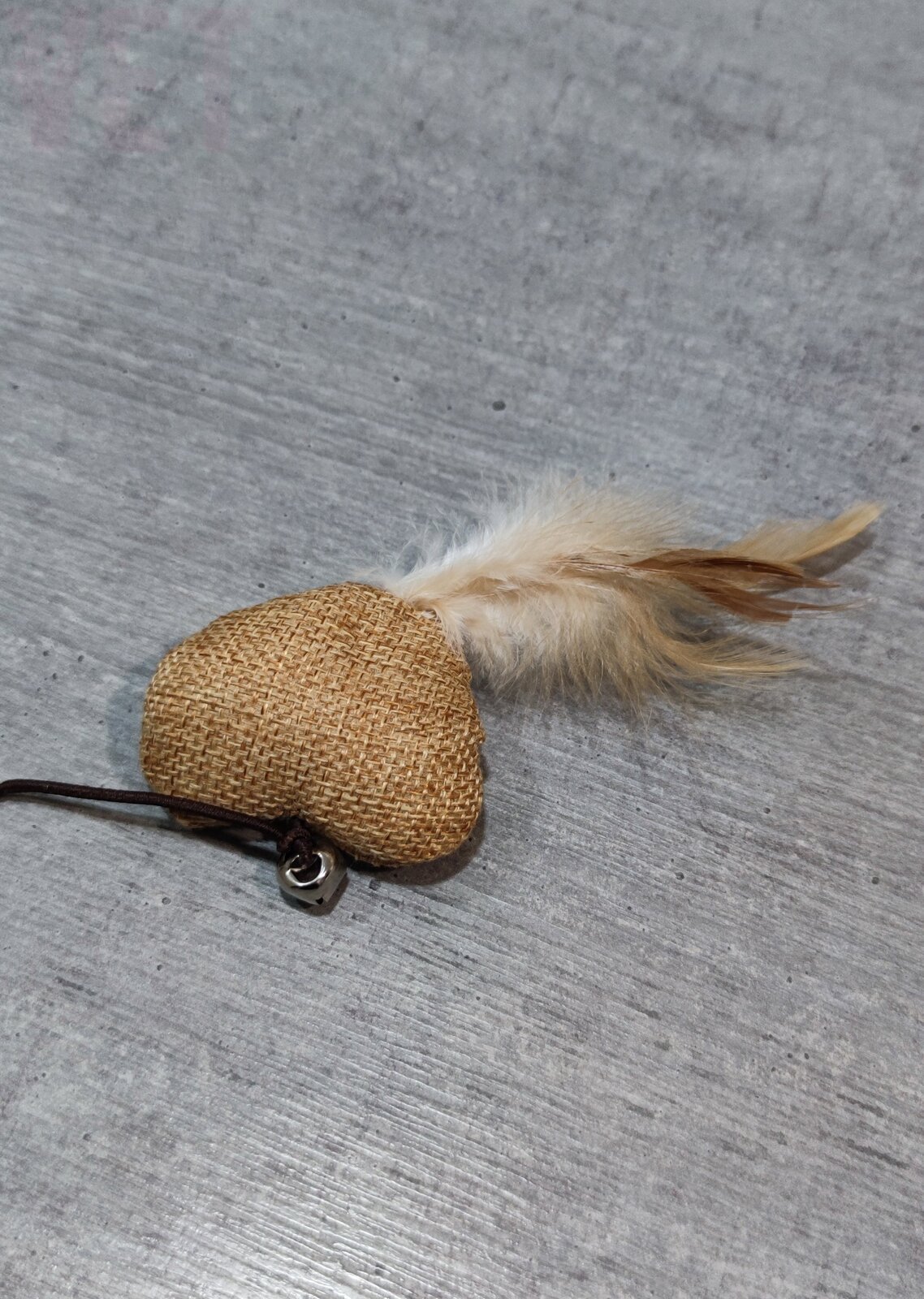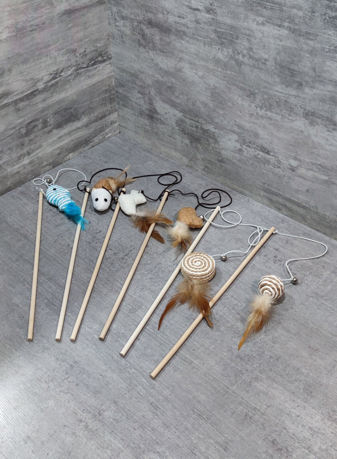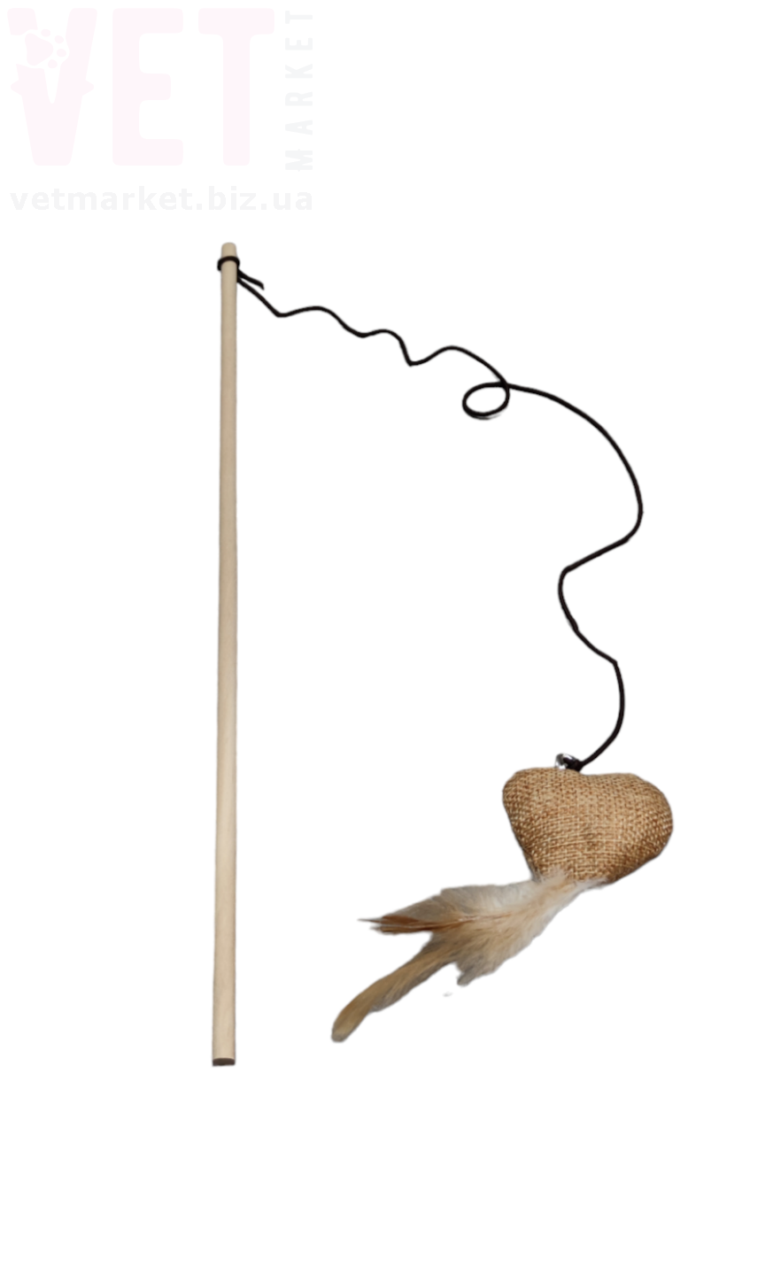 Стильную эко-удочку из дерева будет очень приятно держать в руке, а птичка из мешковины с хвостиком-перышком понравится Вашему котику.