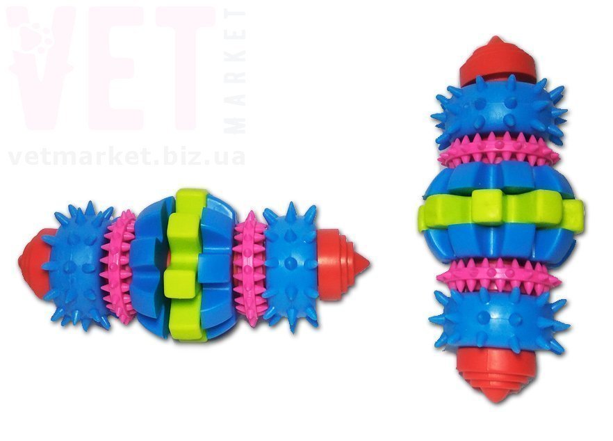 На игрушке находятся вставки с выступающими мягкими шипами и текстурами, которые можно смазать специальной зубной пастой для собак или поместить небольшое количество лакомства между ними. При жевании питомцем игрушки происходит очистка полости рта, поддерживаются зубы и десна в здоровом состоянии. Игрушка избавляет зубы и десна собаки от зуда, особенно у щенков, очищает и удаляет зубной камень, обеспечивает рост и укрепление зубов, укрепляет мышцы челюсти. Позволит избежать разрушений и разгрызания питомцем различной домашней мебели и оборудования.