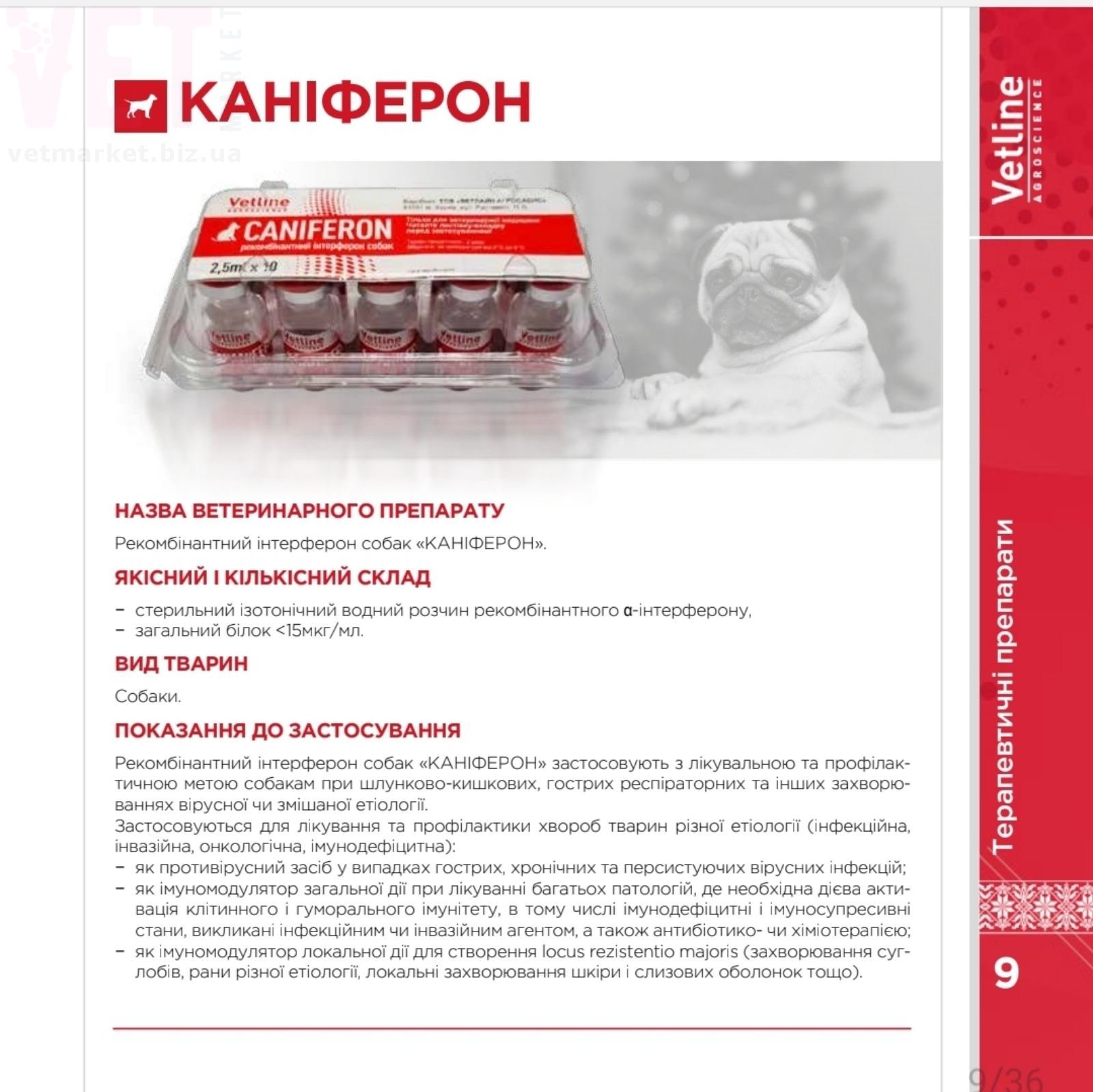 Показання до застосуванняПрепарат Каніферон застосовують у лікувальних та профілактичних цілях собакам при шлунково-кишкових, гострих респіраторних та інших захворюваннях вірусної чи змішаної етіології.