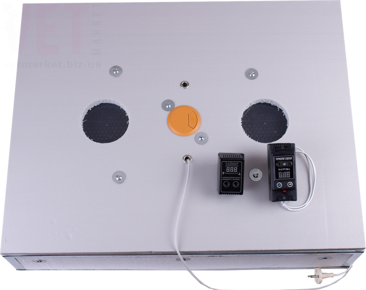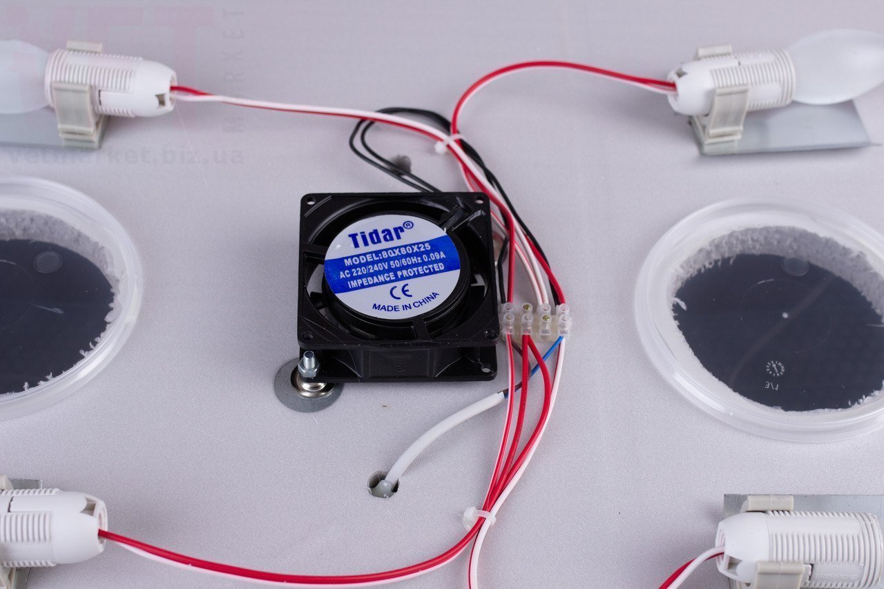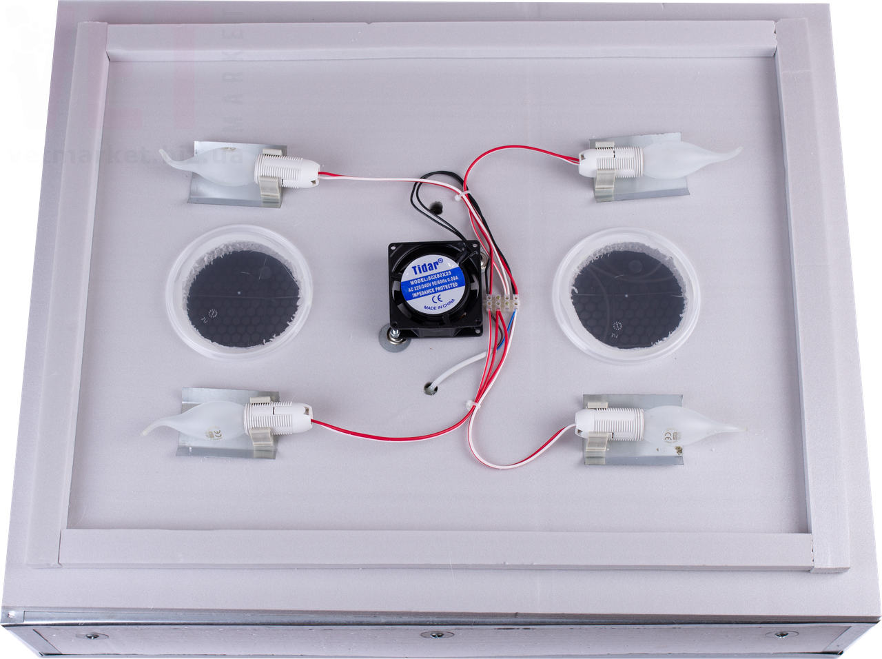 Инкубатор оборудован четырьмя ламповыми нагревательными элементами суммарной мощностью 160 Вт и вентилятором. Поставляется с цифровым терморегулятором.