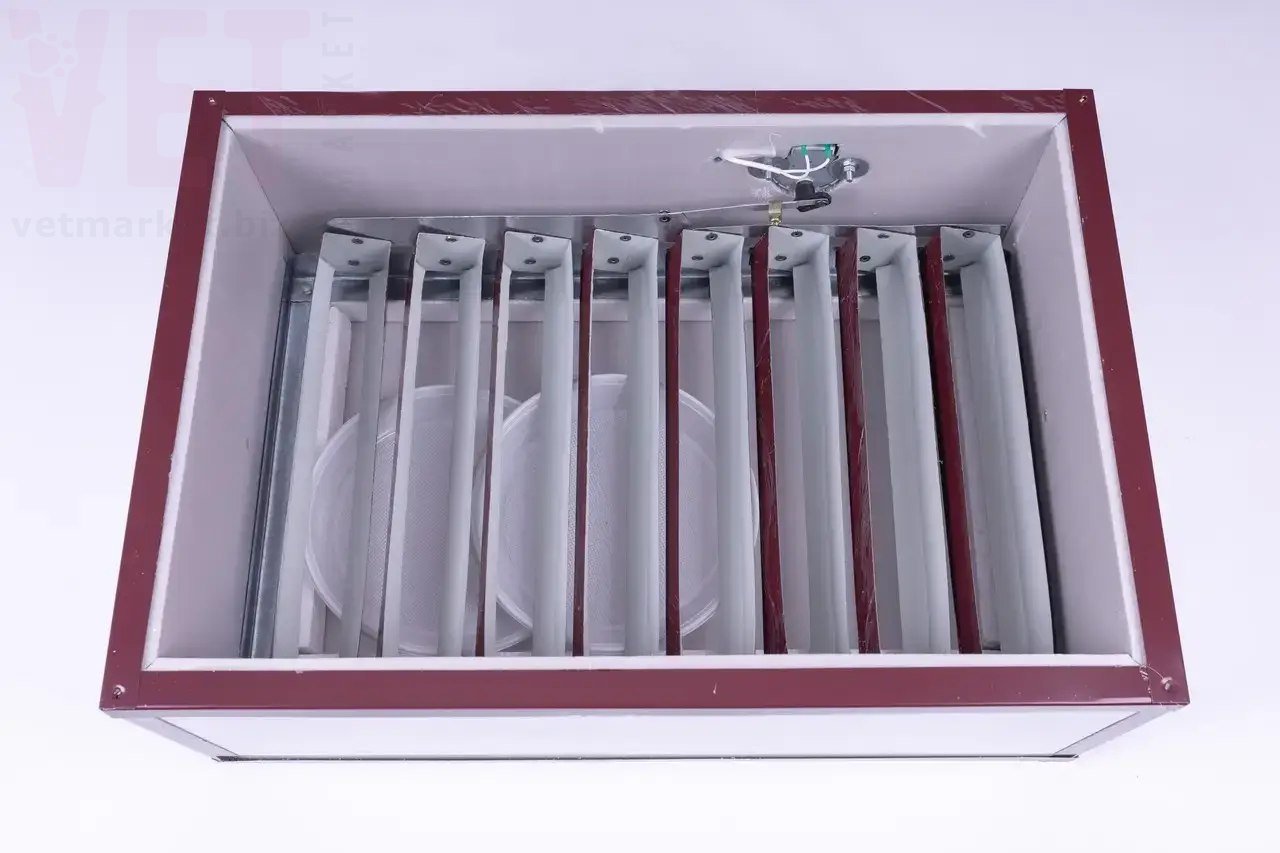 Боковые стороны инкубатора состоят из пенопластового корпуса, оббитого металлическим уголком. Низ у инкубатора пенопластовый, крышка – полистирол. В крышке находится смотровое окно.