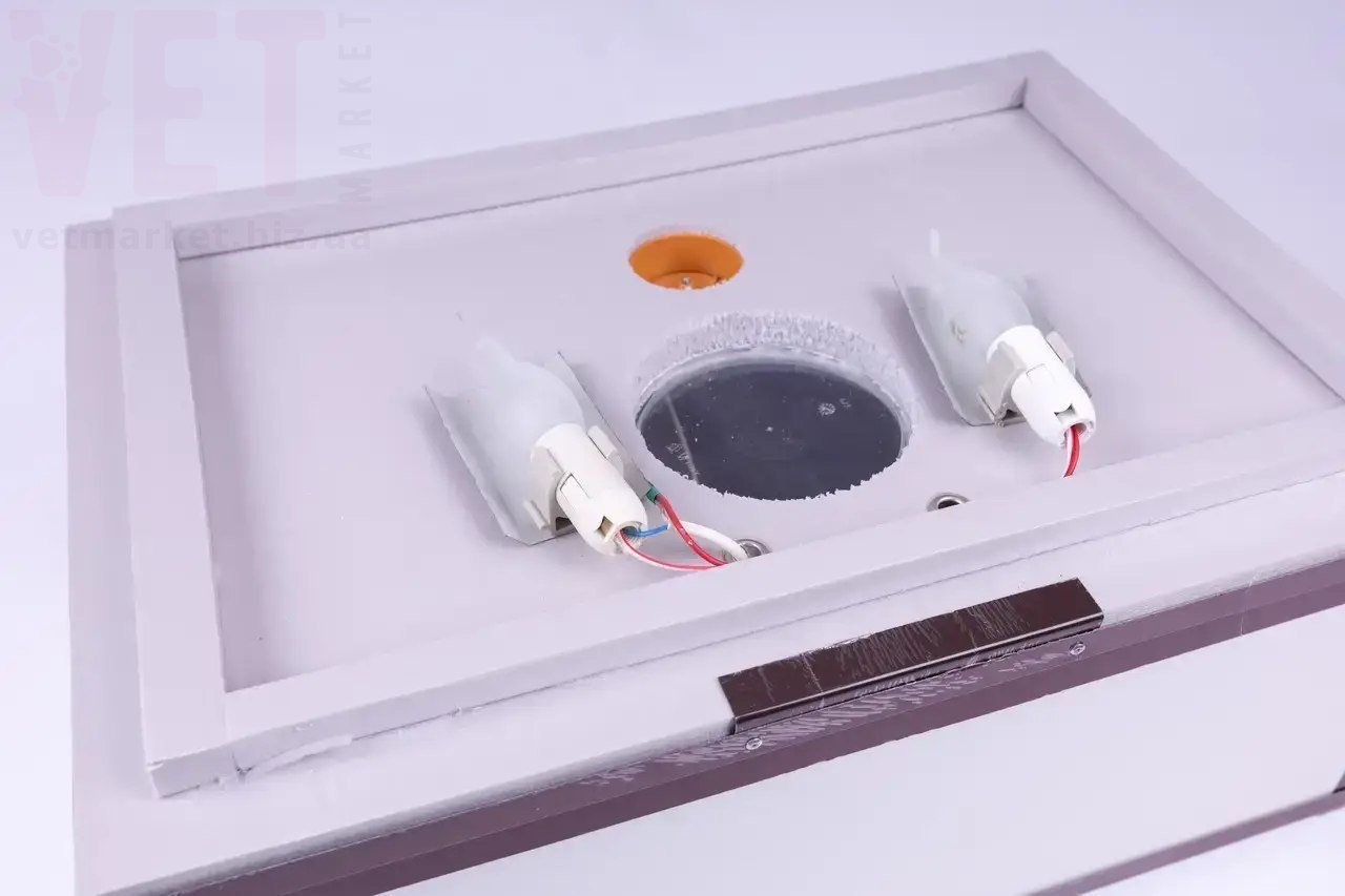 Инкубатор оборудован двумя ламповыми нагревательными элементами суммарной мощностью 80 Вт. Поставляется с цифровым терморегулятором.