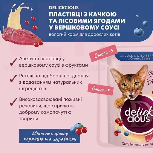 DELICKCIOUS для котів пластівці з качкою та лісовими ягодами у вершковому соусі, 80 г