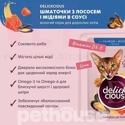 DELICKCIOUS для котів шматочки з лососем та мідіями соусі, 85 г