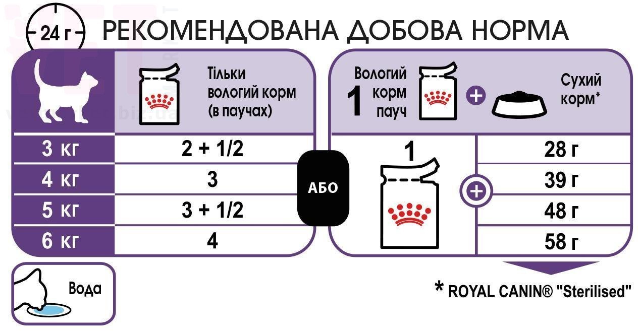 КоличествоПісля стерилізації/кастрації у тварин підвищується апетит і знижується рухова активність, тому їм потрібен спеціальний раціон з урахуванням змінених потреб. Для вигодовування таких вихованців бренд Роял Канін пропонує апетитний паштет у соусі зі збалансованою нутрієнтною та енергетичною формулою.