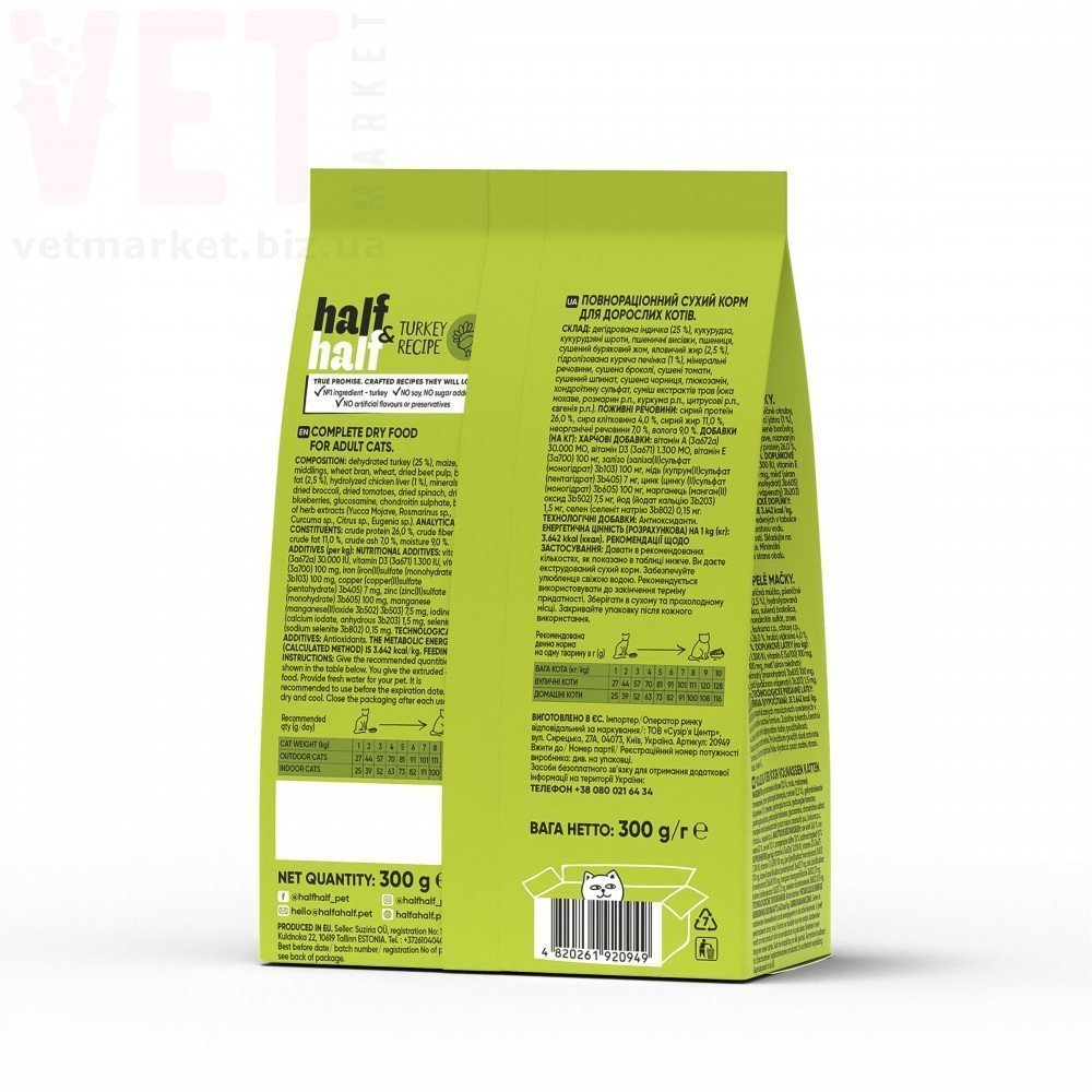 Збагачена фруктами, овочами, хондропротекторами й лікарськими рослинами рецептура Half&Half піклується про оптимальну користь та смак у кожній порції.