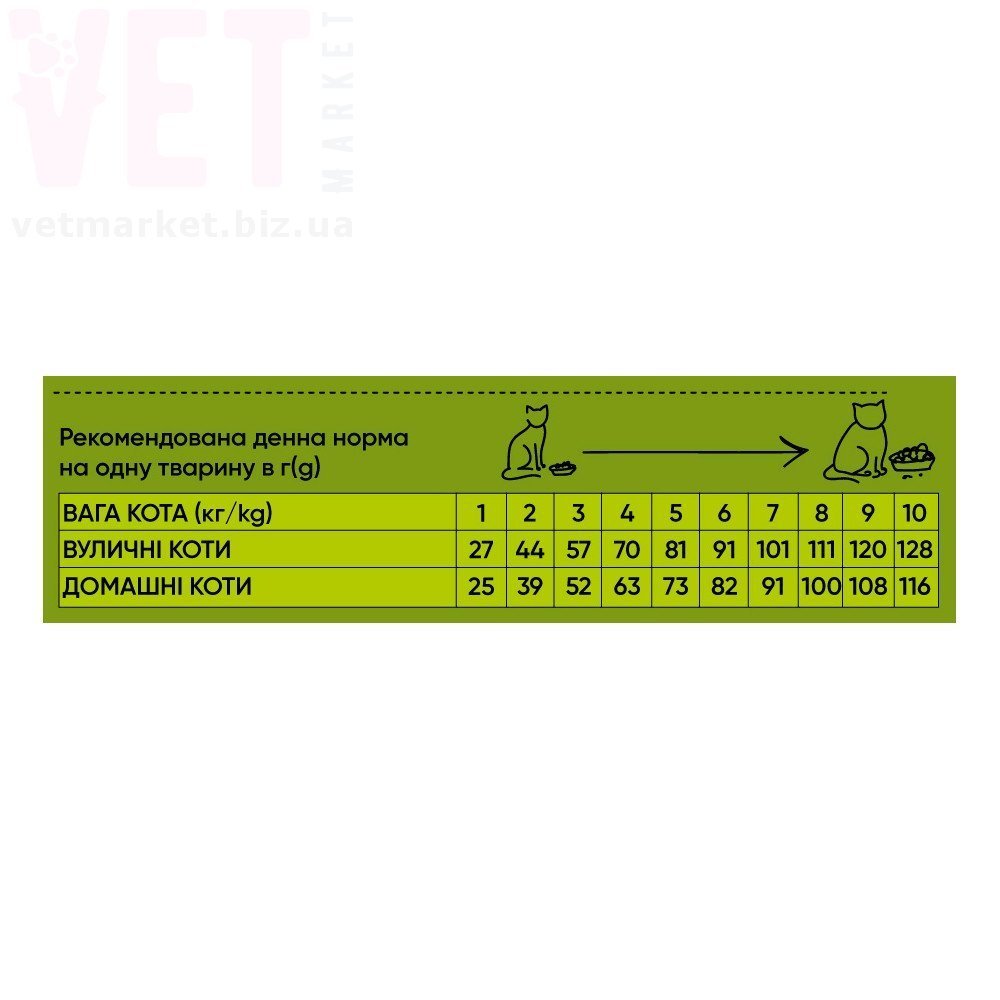 | Домашні коти (г) | 25 | 39 | 52 | 63 | 73 | 82 | 91 | 100 | 108 | 116 |