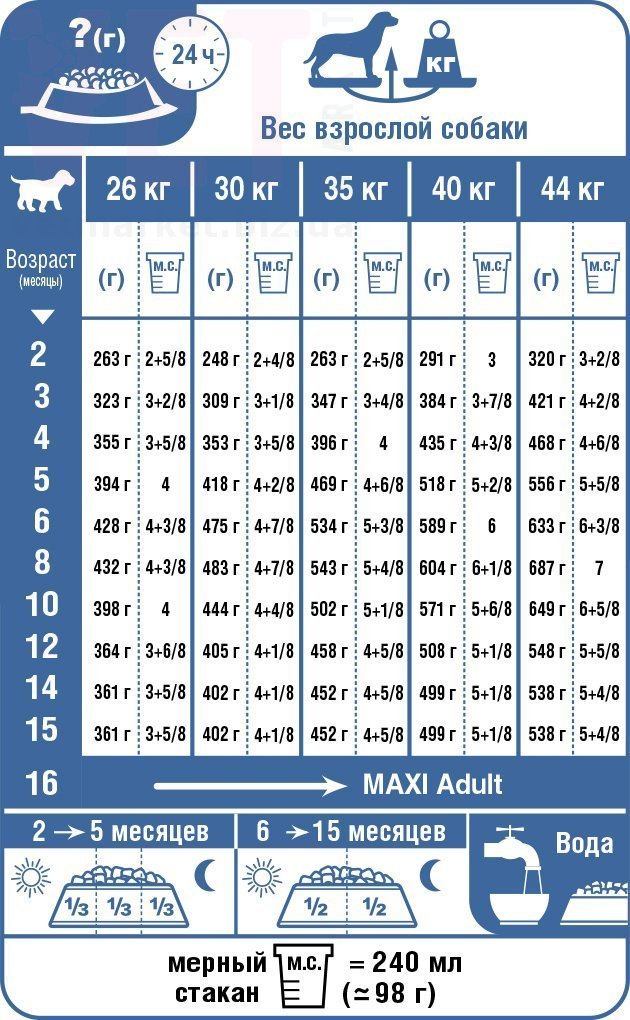 См. таблицу. Корм готов к употреблению. Проследите, чтобы у вашей собаки всегда была свежая вода. Номер серии, регистрационный номер и срок годности указаны на упаковке. Хранить в сухом, прохладном месте.