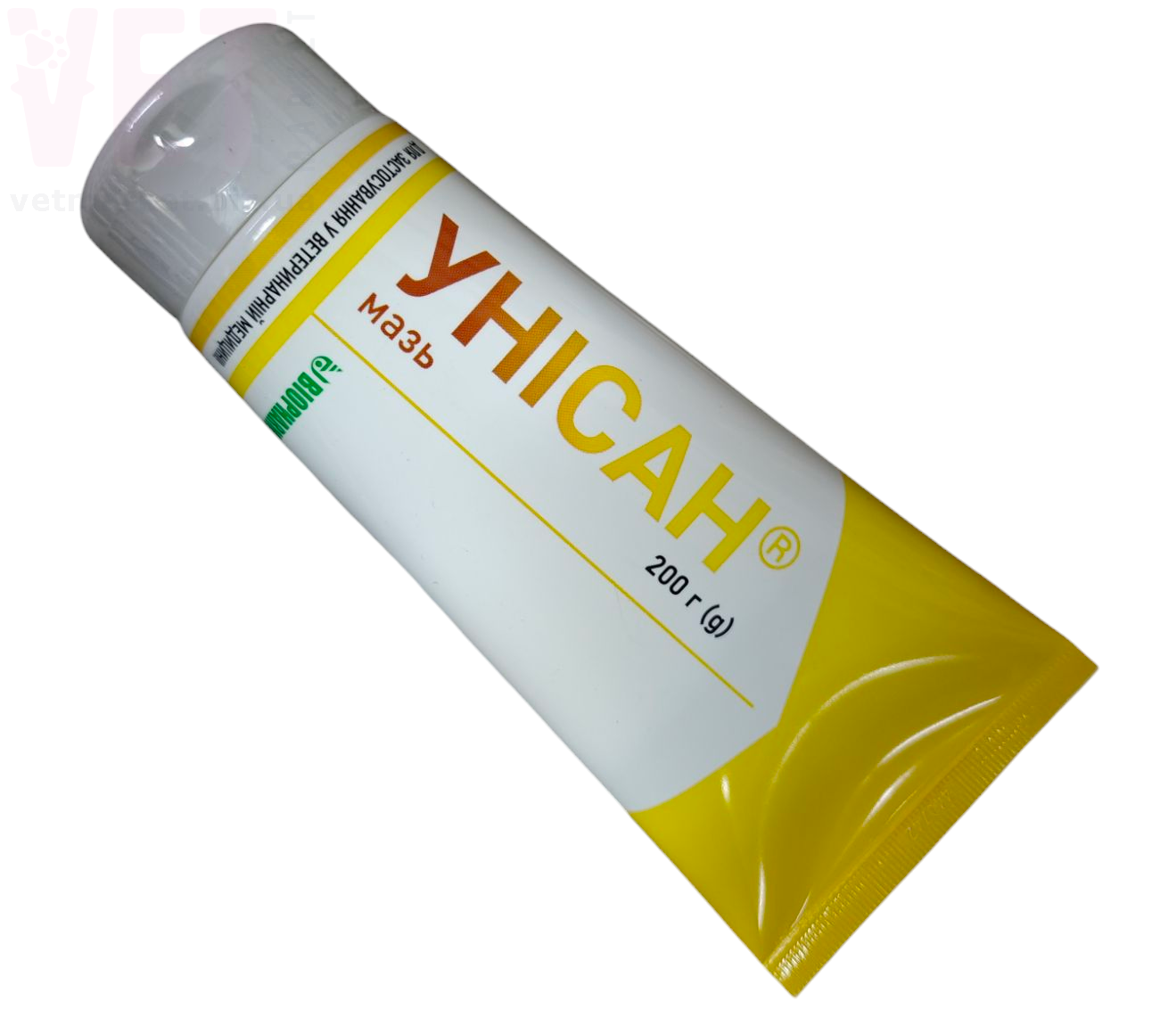 УНИСАН мазь 200 г. Применяется при всех заболеваниях кожи, где участвует бактериальная и грибковая микрофлора (стафилококкоз, все виды пиодермии, импетигинозная экзема, кандидоз, трихофития, микроспория, себорея, наружный отит, гнойные раны и поверхностные абсцессы, ожоги).