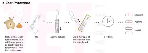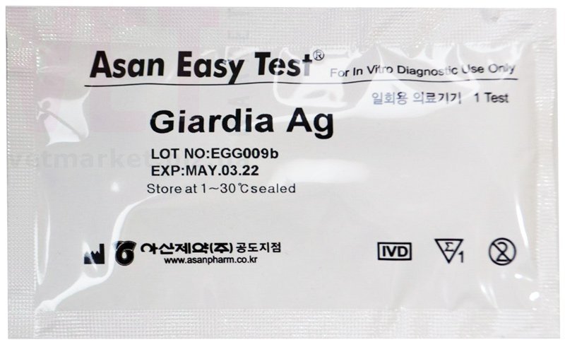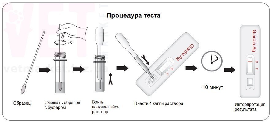 1) Прокрашенные антитела (АTК3), находящиеся на НЦ-мембране возле лунки (S), после внесения образца вступают с ним в реакцию. При наличии в образце антигенов вируса (АГ), антитела (АТК3), связывая их, образуют комплексы антиген-антитело (АГ + АТК3). 2) Расположенные на поперечной полоской (T) антитела (ATT), захватывая комплекс (АГ + АТК3), вызывают их накопление на этой полоске и видимую окрашенную розово-красную линию (АTT + АГ + AТКЗ). 3) Антитела (АТК), расположенные на контрольной полосе (С), связывая остатки (АГ + АТК3), создают комплекс (АТК + AТКЗ + АГ) и видимую полоску в контрольной (С) зоне. Если антигена (АГ) в исследуемого образце нет, в тестовой зоне (Т) реакция связывания не происходит, а в контрольной зоне (C) образуется комплекс (АТК + АТК3) СОСТАВ НАБОРА Тестовый набор Asan Easy Test @ Giardia Ag содержит следующие компоненты: 1. Тест кассета (в индивидуальной фольгированной упаковке с осушителем) 2. Буферный раствор во флаконе 3. Одноразовая пипетка 4. Стерилизованная ватная палочка 5. Инструкция по применению теста МЕРЫ ПРЕДОСТОРОЖНОСТИ 1. Наличие влаги может уменьшить стабильность регентов. Не открывайте фольгированную упаковку с тестом раньше, чем вы проводите исследование. Используйте тест в течение 1 (одного!) часа после его открытия. 2. Hе используйте набор после истечения срока годности. 3. Только для ветеринарного применения. 4. При работе с образцами одевайте одноразовые защитные перчатки и тщательно вымывайте после проведения исследования. 5. Утилизируйте все образцы и наборы после испытания в согласовании с GLP. 6. Никогда не используйте реагенты из второго набора. 7. Не используйте буферный раствор, если он загрязнен бактериями или плесенью. СБОР И ХРАНЕНИЕ ОБРАЗЦОВ Образцом является собачий фекальный материал. Взятые образцы Должны быть протестированы как можно быстрее. При необходимости они могут храниться при 2-8 ° С до 48 часов. Если требуется более длительное хранение, образец может быть заморожен при температуре -20 ° С. ПОРЯДОК ПРОВЕДЕНИЯ АНАЛИЗА 1. Перед проведением теста поместить все образцы и компоненты теста в комнатную температуру (15 - 30 мин). 2. Извлеките тестовое устройство из герметичного пакета и поместите его на ровную и чистую поверхность. 3. Ватной палочкой проведите забор образца кала в 4 разных точках, либо сделайте забор образца непосредственно из толстой кишки животного. 4. Окуните ватную палочку в пробирку с буферным раствором для анализа, пока образец не растворится. 5. Внесите 3 - 4 капли (около 100ul) полученного раствора, взятого одноразовой пипеткой, в лунку для образца (S). 6. В течение 10 минут интерпретируйте результат (ы) теста. Результаты после 20 минут являются не действительными. ИНТЕРПРЕТАЦИЯ РЕЗУЛЬТАТОВ 1. Отрицательный результат Наличие одной окрашенной полоски возле контрольной линии (С). 2. Положительный результат Наличие двух окрашенных линий в тестовой и контрольной зонах. 3. Результат не действителен Отсутствие окрашенной линии в контрольной зоне (С). Даже если наблюдается наличие окрашенной линии в тестовой зоне (Т). ПРИМЕЧАНИЕ Asan Easy Test @ Giardia Ag nредназначен для первичной скрининговой диагностики антигенов лямблий (гиардий) животных. Этот комплект может обеспечить быстрый и простой способ получить подтверждение диагноза, но также не следует исключать возможности получения ложноположительного или ложноотрицательного рез