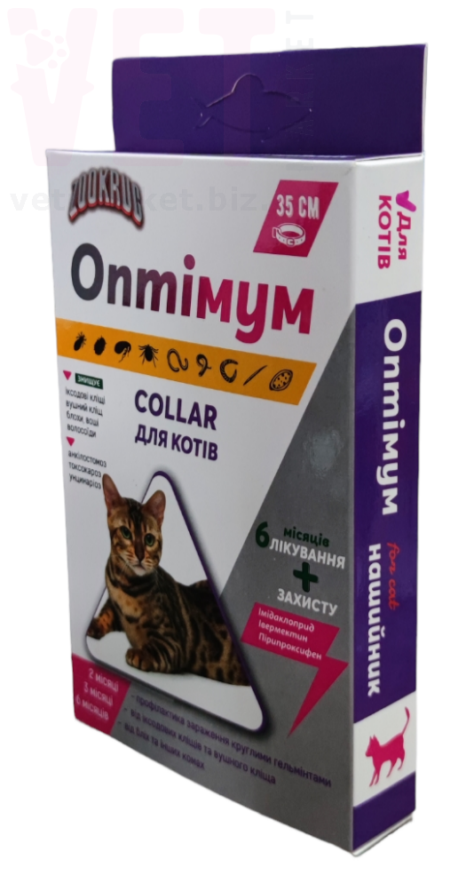Показання до застосування: Діючі речовини, що входять до складу нашийника, мають контактну і системну протипаразитарну дію на статевозрілі та личинкові фази розвитку бліх (Ctenocephalides canis, Ctenocephalides felis), вошей (Linognathus setosus), власоїдів (Trichodectes cansus, Felic) cynotis), іксодових кліщів (Ixodidae), саркоптиформних кліщів (Оtodectes cynotis, Notoedres cati, Sarcoptes canis), тромбідиформних кліщів (Demodes spp., Cheyletiella spp.), паразитиформних кліщів (Dermacentor spp., Ixodes spp., Rhipicephalus spp.) та нематод шлунково-кишкового тракту, в т.ч. Toxocara spp., Toxascaris spp., Trichuris vulpis, Uncinaria stenocephala та Ancylostoma spp., які паразитують у котів.