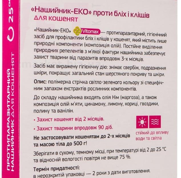 ЭКО ошейник для кошенят VitomaxТМ - противопаразитарное, гигиеническое средство для профилактики и уничтожения блох, клещей и прочих эктопаразитов. В составе только природный компоненты (композицию масел). Постоянное выделение природных репеллентов из мягкой фактуры ошейника обеспечивает защиту животного от паразитов на протяжении 3-х месяцев.