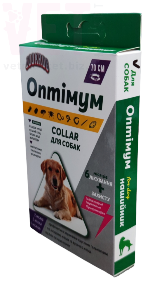 Показання до застосування: Діючі речовини, що входять до складу нашийника, мають контактну і системну протипаразитарну дію на статевозрілі та личинкові фази розвитку бліх (Ctenocephalides canis, Ctenocephalides felis), вошей (Linognathus setosus), власоїдів (Trichodectes cansus, Felic) cynotis), іксодових кліщів (Ixodidae), саркоптиформних кліщів (Оtodectes cynotis, Notoedres cati, Sarcoptes canis), тромбідиформних кліщів (Demodes spp., Cheyletiella spp.), паразитиформних кліщів (Dermacentor spp., Ixodes spp., Rhipicephalus spp.) та нематод шлунково-кишкового тракту, в т.ч. Toxocara spp., Toxascaris spp., Trichuris vulpis, Uncinaria stenocephala та Ancylostoma spp., які паразитують у собак.