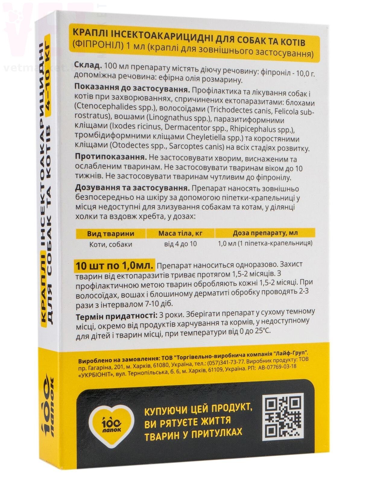 100 лапок для собак та котів 4-10 кг, 10 піп.*1 мл, Vitomax