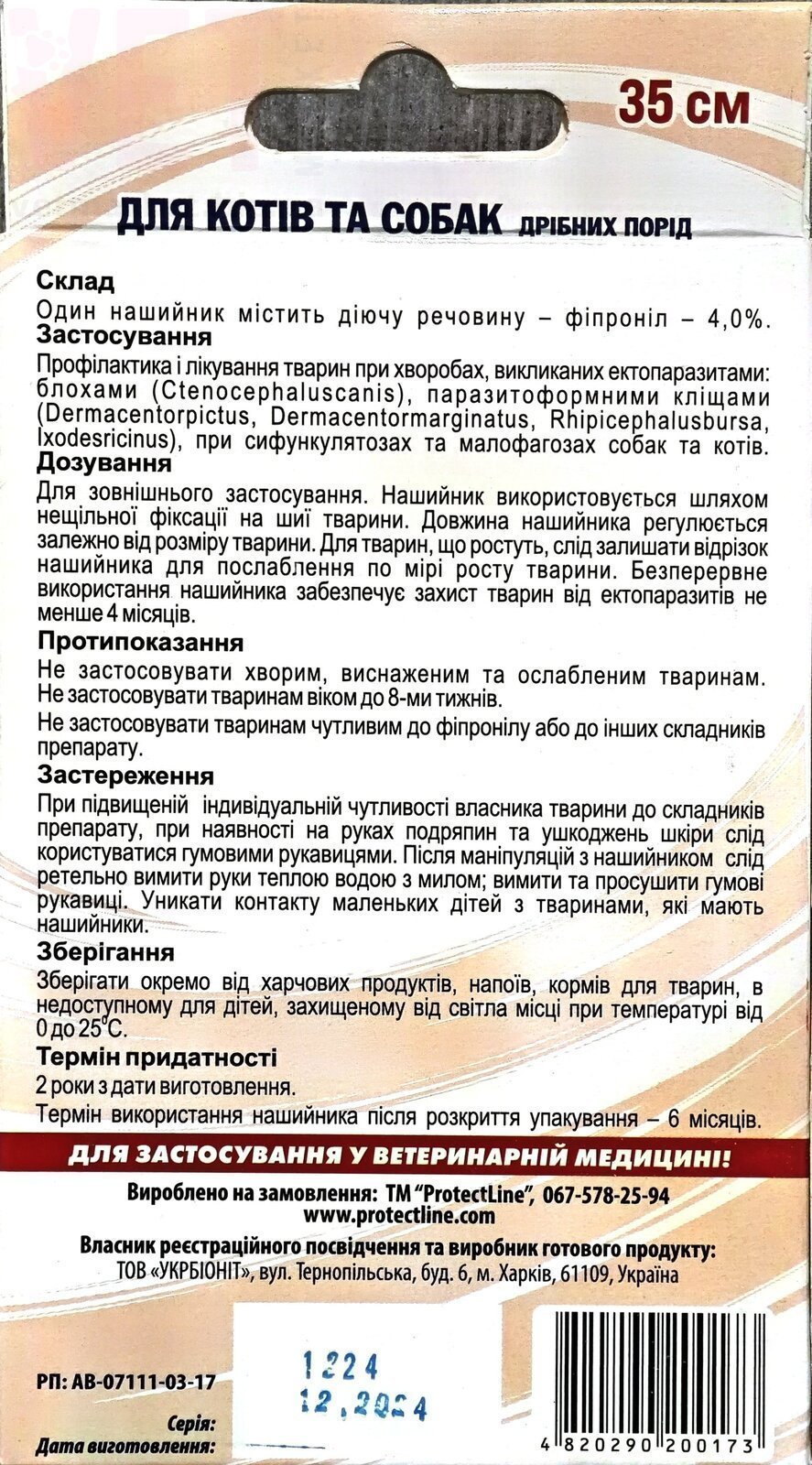 . Дозировка: Для наружного применения. Ошейник используется путем неплотной фиксации на шее животного. Длина ошейника регулируется в зависимости от размера животного. Для растущих животных следует оставлять отрезок ошейника для ослабления по мере роста животного. Непрерывное использование ошейника обеспечивает защиту животных от эктопаразитов не менее 4 месяцев. Противопоказания: Не застоливать больным, истощенным и ослабленным животным. Не заставлять животным в возрасте до 8 недель. Не применять животным чувствительным к фипронилу или другим составляющим препарата. Срок годности: 2 года с даты изготовления. Срок использования ошейника после вскрытия упаковки – 6 месяцев.