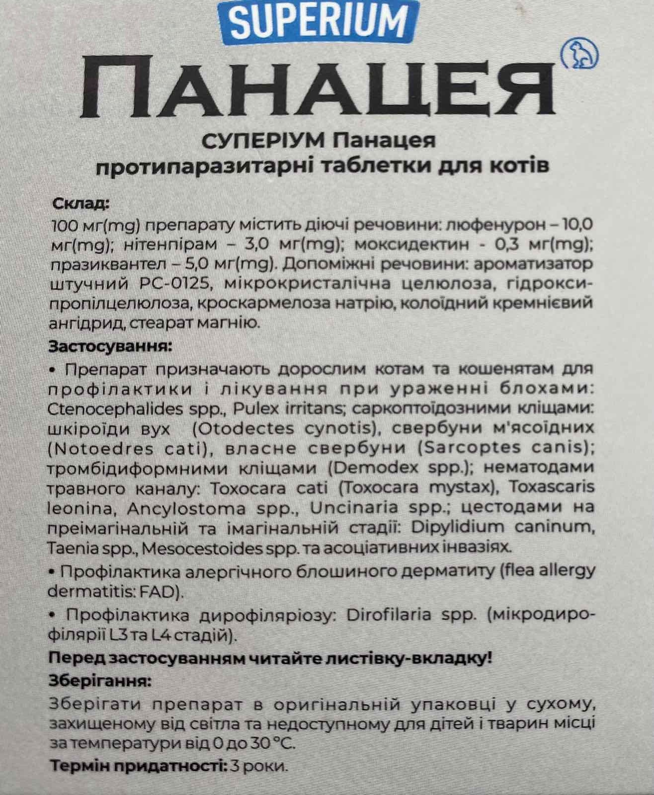 СУПЕРІУМ Панацея – інноваційна пігулка від усіх видів котячих паразитів.
