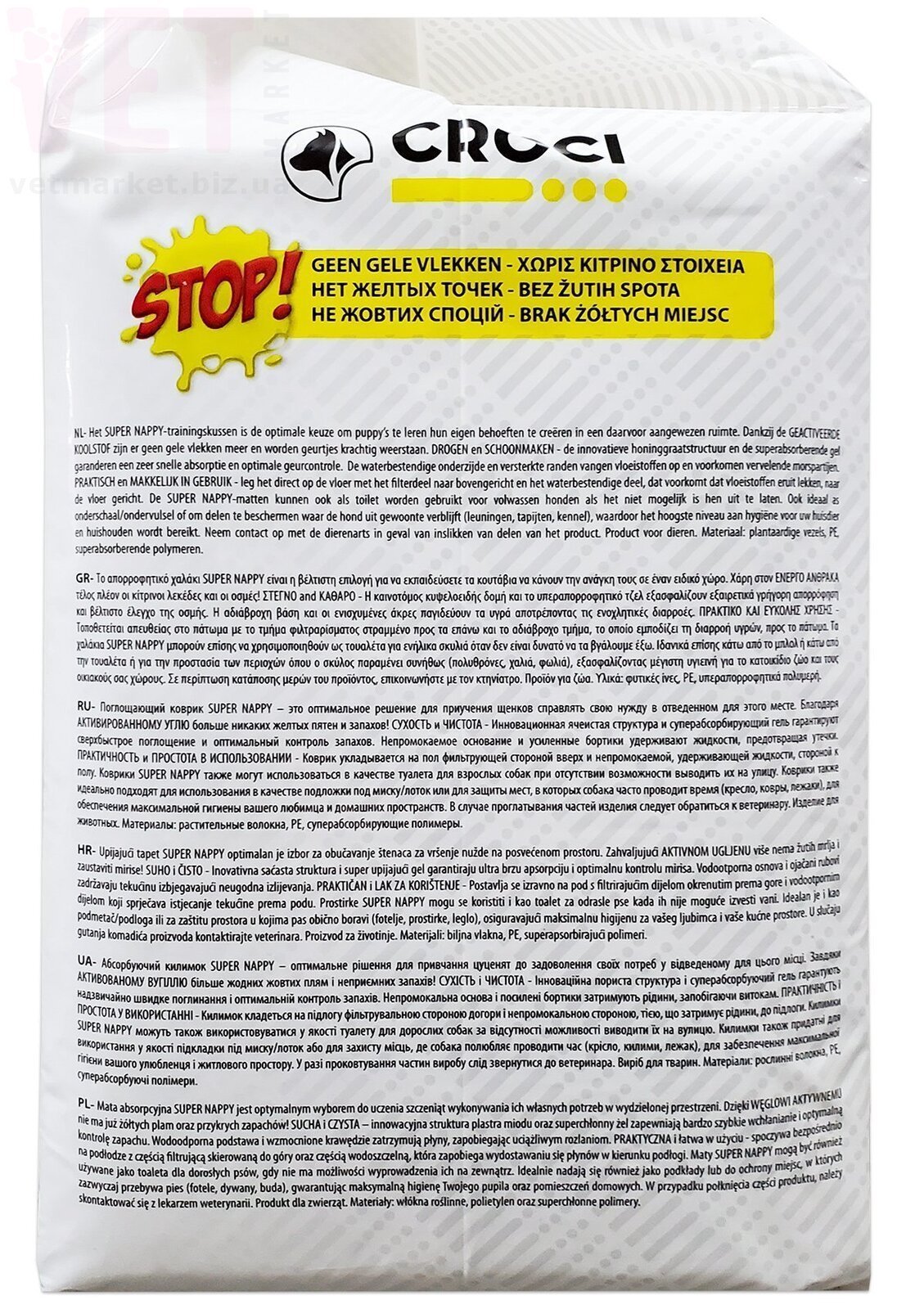 Поглощающие коврики (пеленки) SUPER NAPPY - это оптимальное решение для приучения щенков справлять свою нужду в отведенноv для этого месте. Благодаря активированному углю больше никаких желтых пятен и запахов! Сухость и чистота - инновационная ячеистая структура и суперабсорбирующий гель гарантируют сверхбыстрое поглощение и оптимальный контроль запахов. Непромокаемое основание и усиленные бортики удерживают жидкости, предотвращая утечки. Практичность и простота в использовании. Коврик укладывается на пол фильтрующей стороной вверх и непромокаемой, удерживающей жидкости, сторной к полу. Коврики SUPER NAPPY также могут использоваться в качестве туалета для взрослых собак при отсутствии возможности выводить их на улицу. Коврики также идеально подходят для использования в качестве подложки под миску/лоток или для защиты мест, в которых собака часто проводит время (кресло, ковры, лежаки) для обеспечения максимальной гигиены вашего любимца и домашних пространств. В случае проглатывания частей изделия следует обратиться к ветеринару. Изделие для животных. Материалы: растительные волокна, РЕ, суперабсорбирующие полимеры.