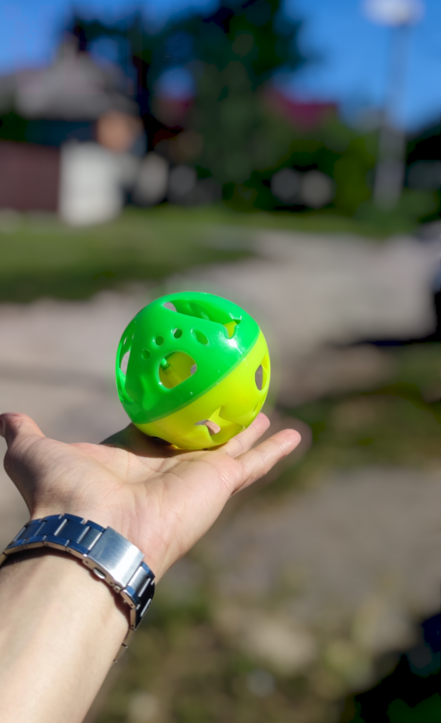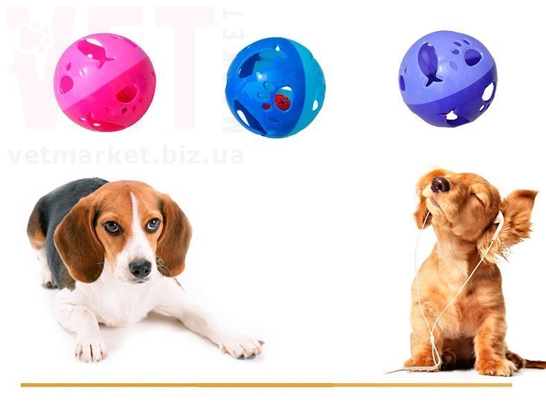 Забавный яркий шарик с колокольчиком подойдет и для игривого котика, так и для озорной собаки.