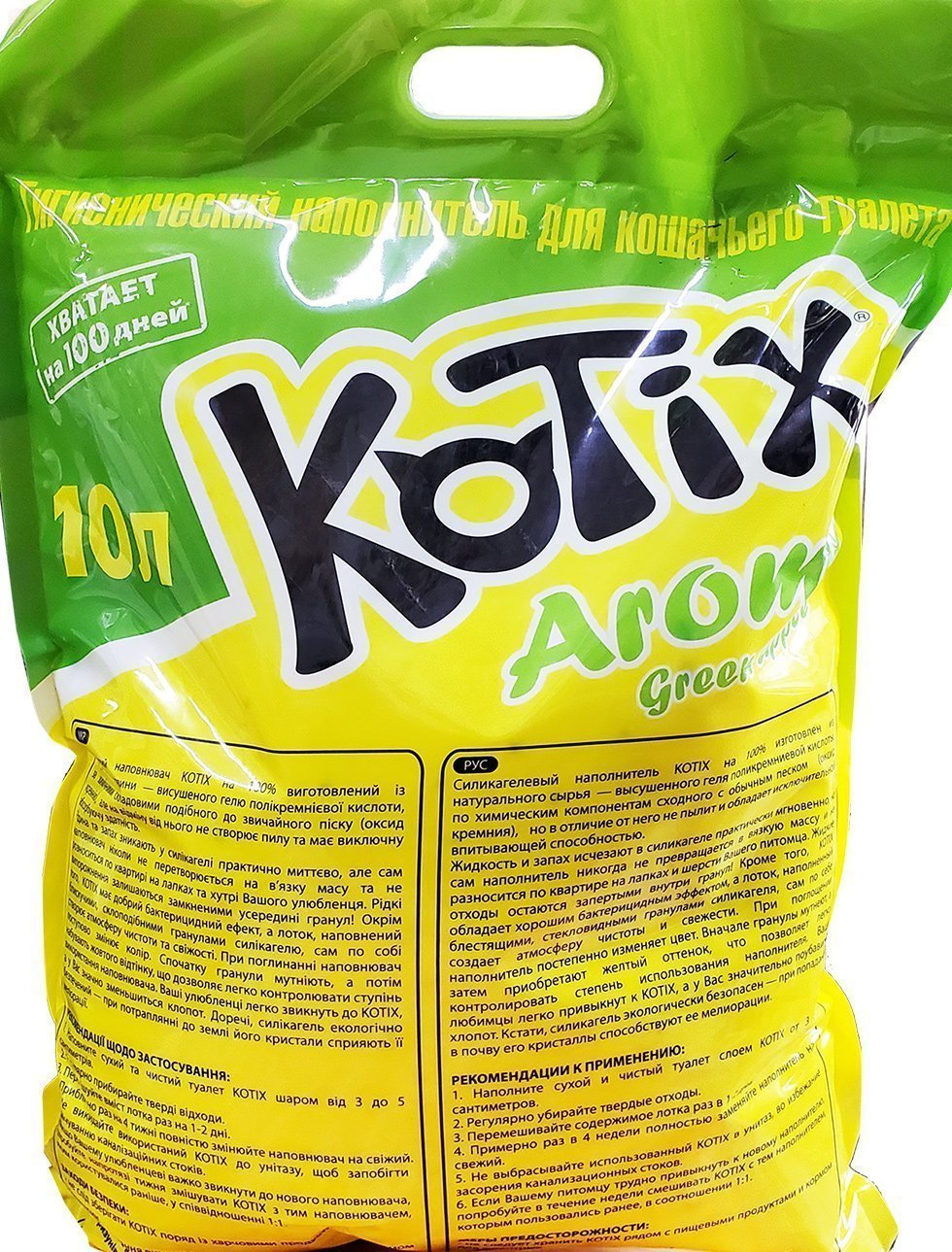 Kotix (Котикс) Aroma Green apple - силикагелевый гигиенический наполнитель с ароматом яблока для кошачьего туалета, упаковка 10 л - хватает на 100 дней. Производится из натурального сырья (высушенного геля поликремниевой кислоты или оксида кремния) и обладает превосходными сорбирующими свойствами. Жидкость и запах поглощаются силикагелем практически мгновенно, а сам наполнитель сохраняет твердость фракции и не разносится на лапках Вашего питомца по квартире. Жидкие отходы остаются заключенными внутри гранул наполнителя. Kotix обладает хорошим бактерицидным эффектом. При впитывании силикагель постепенно меняет цвет. Постепенное наполнение гранул жидкостью, позволяет легко контролировать степень использования наполнителя. Оптимальный размер фракции способствует быстрому привыканию Вашего питомца к данному наполнителю и исключает прилипание к шерсти. Силикагелевый наполнитель Kotix экологически безопасен - при попадании в почву его кристаллы способствуют мелиорации.