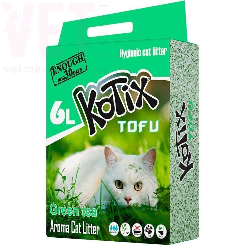 Наповнювач для котячого лотку KOTIX TOFU Green Tea, 6 л — натуральний рослинний наповнювач на основі соєвого тофу з легким ароматом зеленого чаю, який ефективно поглинає вологу та нейтралізує неприємні запахи. Приємний аромат допомагає підтримувати свіжість і чистоту навколо котячого лотка.