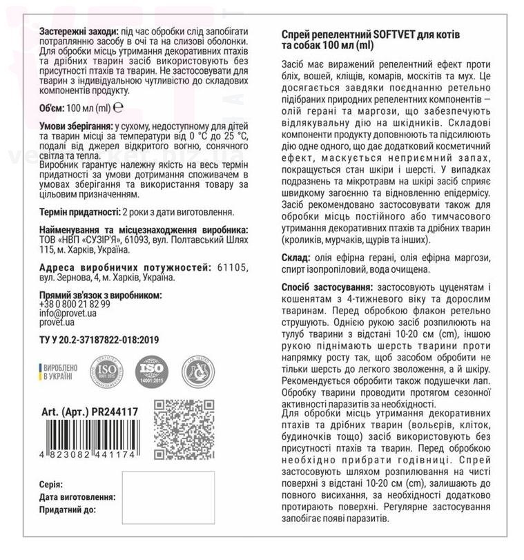 СофтВет спрей репелентний, 100 мл, ProVET