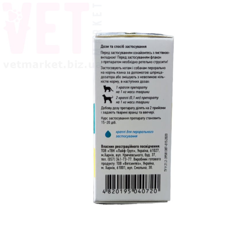 Собаки: 2 краплі (0,1 мл) препарату на 1 кг маси тварини