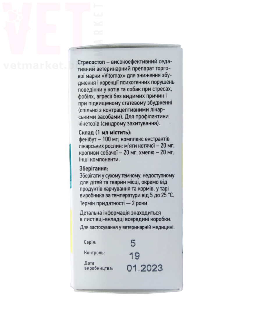 СТРЕСОСТОП - високоефективний седативний ветеринарний препарат для зниження збудження та корекції психогенних порушень поведінки у кішок та собак при стресах, фобіях, агресії без видимих причин та при підвищеному статевому збудженні (спільно з контрацептивними лікувальними засобами). Для профілактики кінетозів (синдрому заколісування).