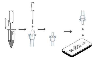 3) Потім натисніть на пробірку з буфером і капніть дві краплі вищевказаної суміші (приблизно 60μL) в отвір для зразка.
