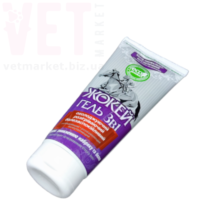 КоличествоЛечебно-косметическое средство Гель Жокей 3 в 1, в тубе 200 г, изготовленное из натуральных компонентов в виде геля с охлаждающим, разогревающим и обезболивающим действием, способствующим устранению воспаления и боли, расширению кровеносных сосудов в области воспаления, уменьшения отеков, восстановления работы пораженных тканей у лошадей.