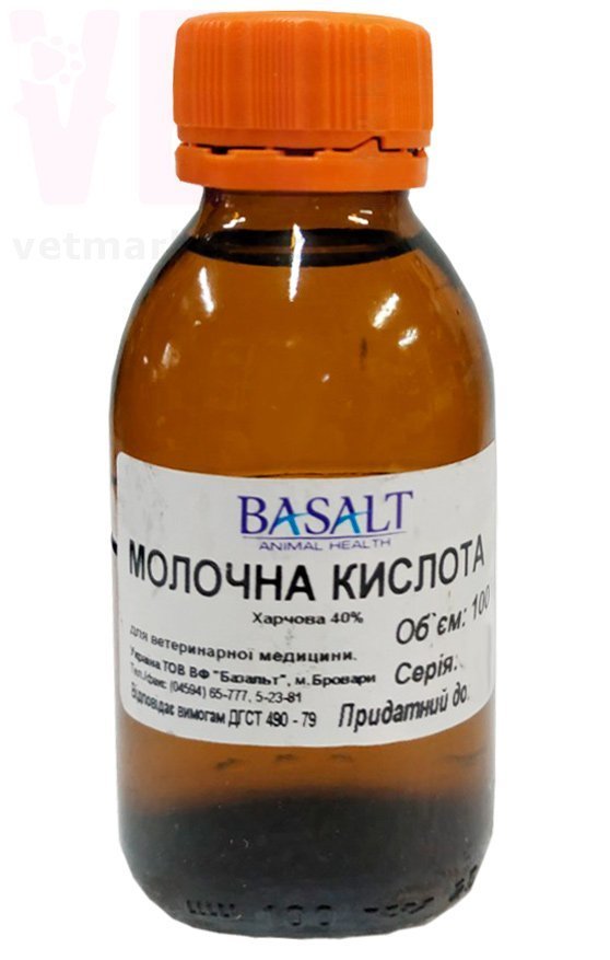 Применение: Для профилактики и лечения воспаления кишечника, гастритов с пониженной секреторной функцией, энтеритов, тимпании у жвачных животных, а также при метеоризме и при остром расширении желудка. Как средство, способствующее расслаблению сфинктеров, применяют внутрь молочную кислоту 40% в следующих дозах на одно животное: лошадям - 5-35 мл крупному рогатому скоту - 8-40 мл овцам - 1,5-7,5 мл, свиньям - 0,5-7,5 мл, собакам - 0,2-2,5 мл, лисицы и песца - 0,7-2,5 мл задают в водном растворе НЕ более 2% концентрации. При трихомоноз крупного рогатого скота влагалище спринцуют 1% водным раствором. При язвенных поражениях кожи и слизистых оболочек как прижигающее средство в 10-40% растворах. Для повышения яйценоскости кур-несушек в дозе 0,5 мл 40% концентрации на 1 кг корма (500 мл на 1 тонну корма) в течение 3 месяцев подряд. Для дезинфекции воздуха в инкубаторах, птичниках, телятниках и других животноводческих помещениях в присутствии птицы и животных применяют в форме аэрозоля (распилили 20% кислоту) в дозе 15 - 20 мл/м3.