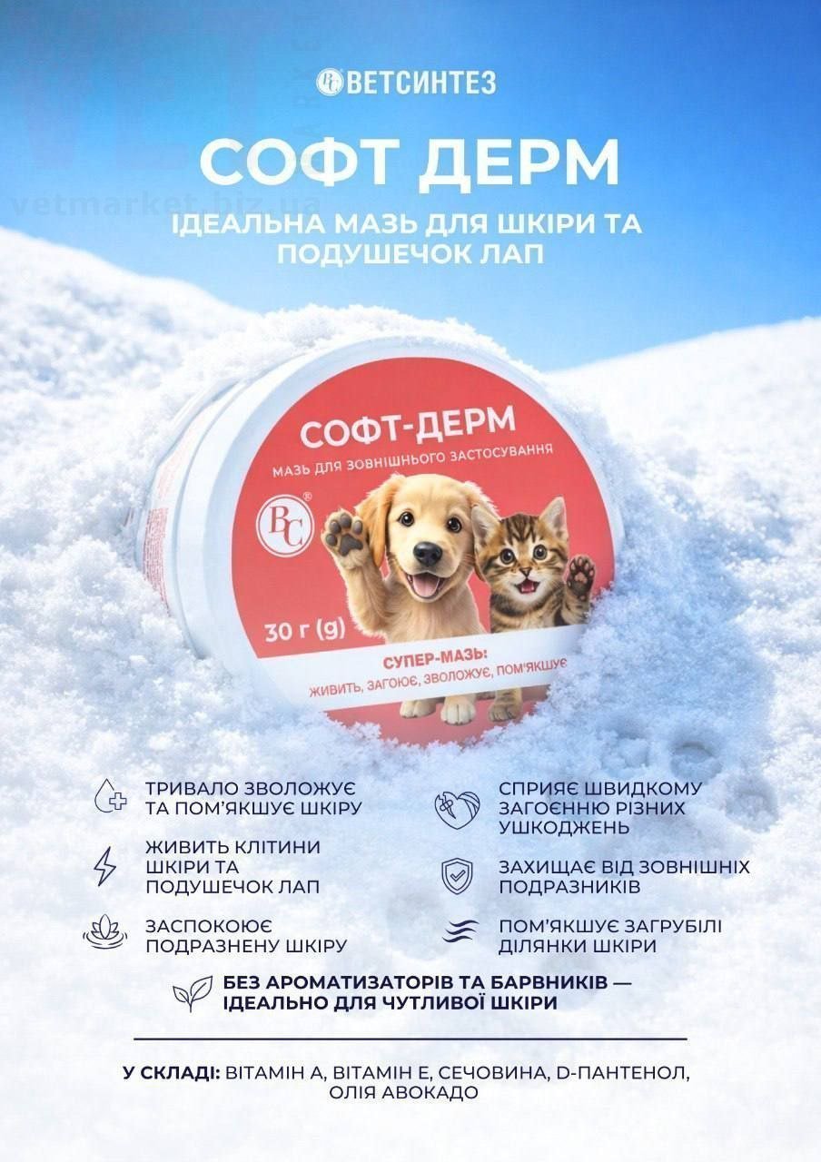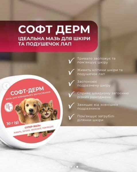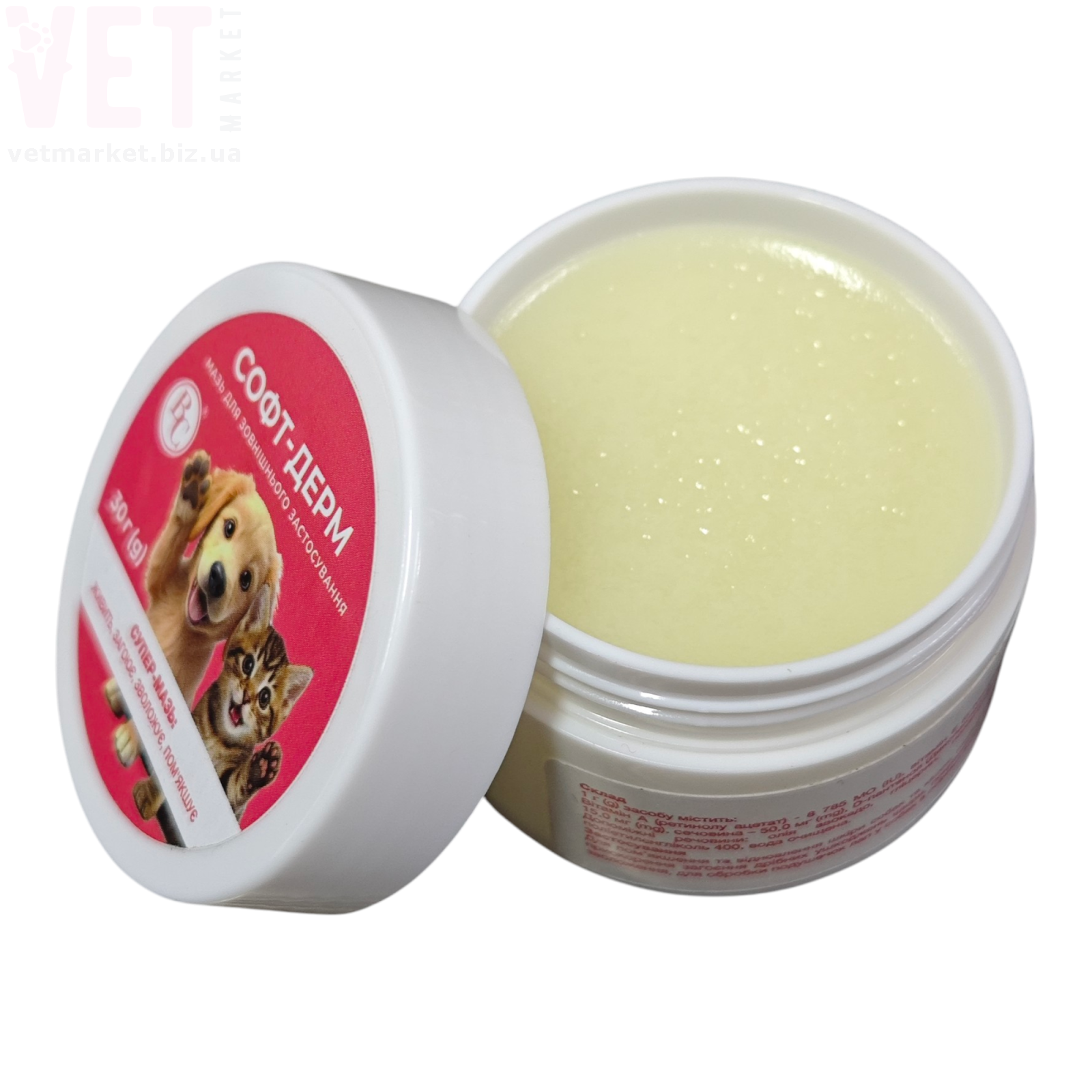 СОФТ-ДЕРМ — ефективний пом’якшувальний і захисний ветеринарний засіб для догляду за шкірою тварин. Мазь активно зволожує, живить і відновлює шкіру, сприяє загоєнню дрібних ушкоджень, тріщин і саден, а також захищає від негативного впливу зовнішніх факторів.