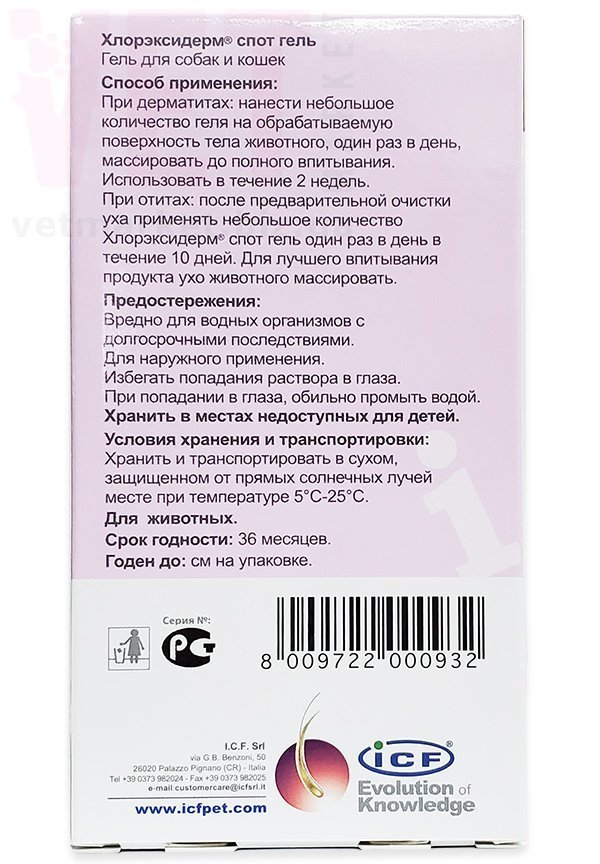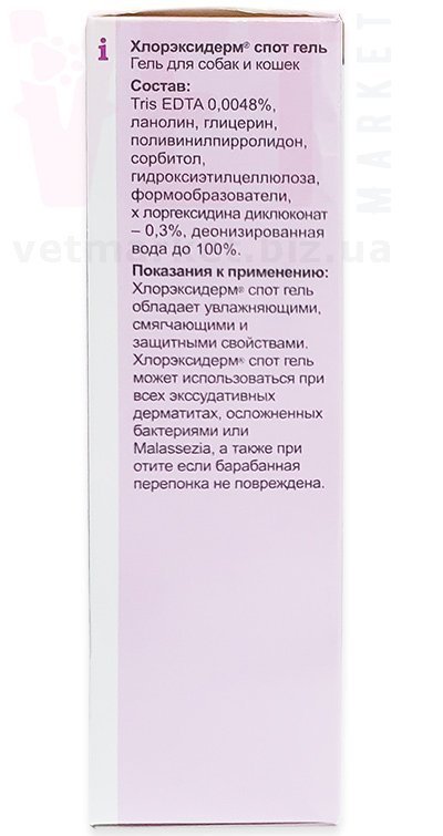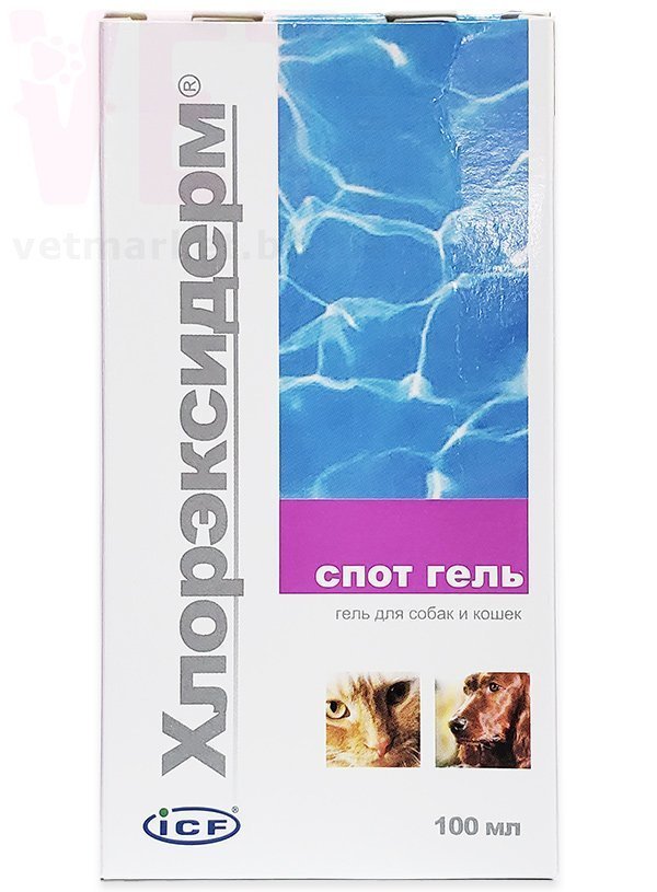 Хлорэксидерм спот гель, благодаря гель-формуле, надёжно фиксируется на коже и долго остается на ней. Это свойство, в сочетании с синергизмом между хлоргексидином и Tris-EDTA, делает продукт оптимальным для борьбы с микроорганизмами, чувствительными к хлоргексидину (бактерии и дрожжи), как на коже, так и в ушах (при отсутствии повреждения барабанной перепонки). Хлорэксидерм спот гель рекомендован в следующих случаях: - при всех экссудативных дерматитах, осложненных бактериями или Malassezia, например, опрелости, межпальцевый дерматит и поврежденные участки на коже. - при отите, вызванном Malassezia, если барабанная перепонка не повреждена.