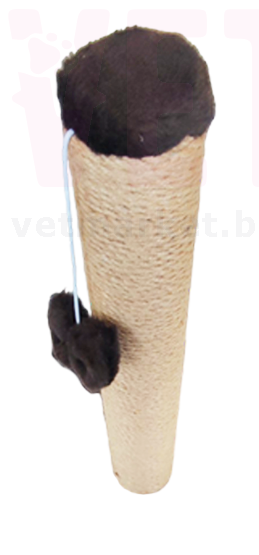 Когтеточка напольная с квадратным основанием. Представляет собой подставку покрытую мягкой тканью, на которой укреплен столбик с плюшевой игрушкой на веревке. Столбик обтянутый джутовой веревкой, чтобы кошка могла точить когти вертикально. Когти у кошек растут всю жизнь, поэтому их необходимо стачивать, такой предмет как когтеточка поможет решить эту проблему.