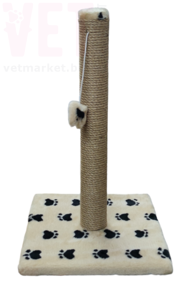Когтеточка напольная с квадратным основанием. Представляет собой подставку покрытую мягкой тканью, на которой укреплен столбик с плюшевой игрушкой на веревке. Столбик обтянутый джутовой веревкой, чтобы кошка могла точить когти вертикально. Когти у кошек растут всю жизнь, поэтому их необходимо стачивать, такой предмет как когтеточка поможет решить эту проблему.
