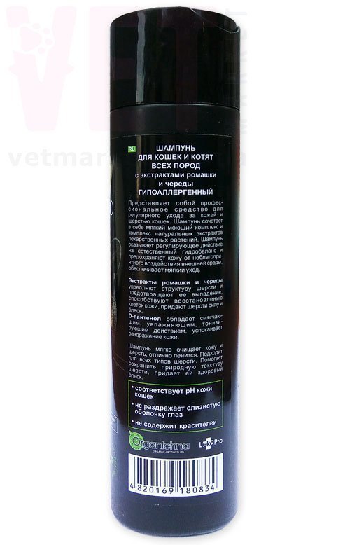 Шампунь для кошек и котят с экстрактами ромашки и череды гипоаллергенный. Представляет собой профессиональное средство для регулярного ухода за кожей и шерстью кошек. Шампунь сочетает
